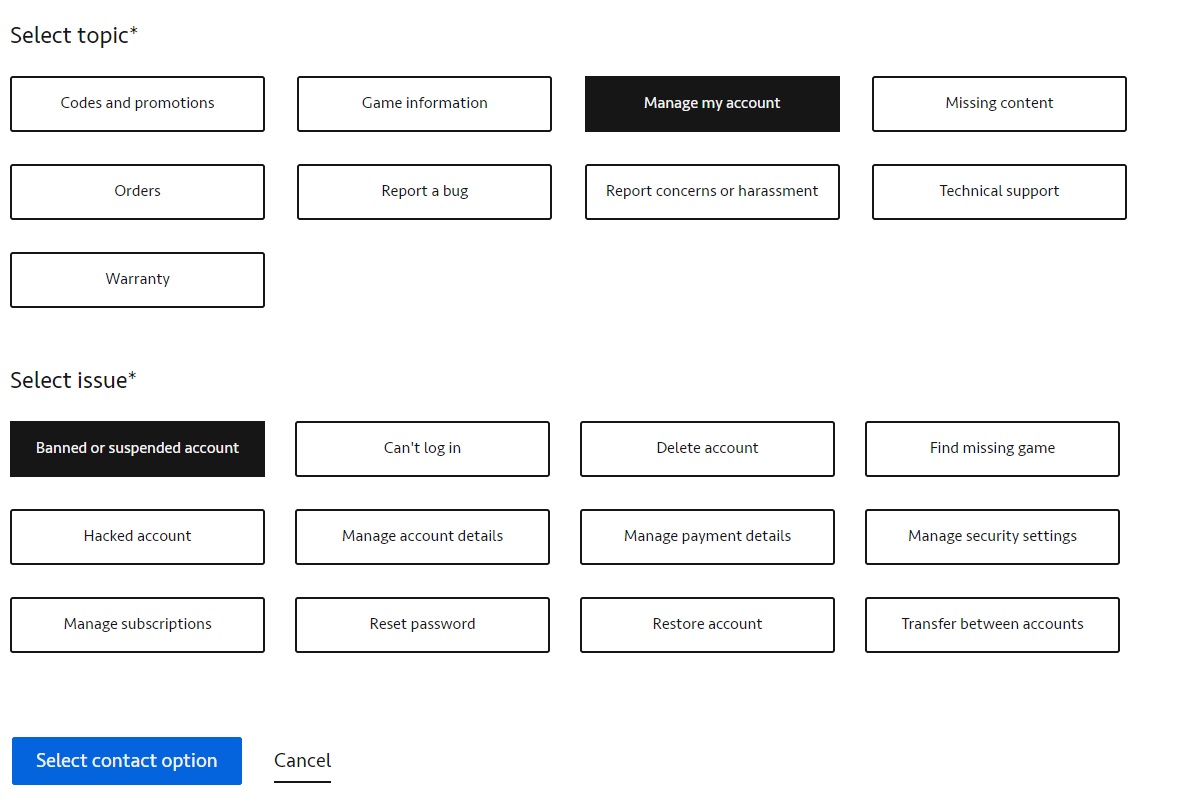 Contact EA Linke girdikden sonra şunları takip et. < Resime gitmek için tıklayın > Select contact Option tıkladıkdan gelen sayfada ea ile iletişim maili geliyor. Orada maile yazman gereken şeyleri talimat şeklinde vermiş . Ona göre maili hazırlayıp gönder. Biraz ingilizcen olsa iyi olur. Ben translate kullanmıştım anlaşılması zor duruma sokmuştum kendimi. Allahdan bana dönüş yapan eleman çok mülayim bir kişilikdi. Halden anladı