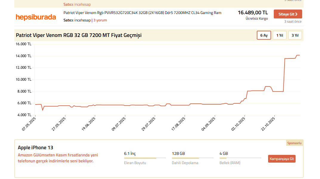 Lexar’ın ddr5 Cl30 6000 MHz 32 gb’lık modelini 5500tl’sına almıştım. Dün baktım 18 bin tl olmuş!