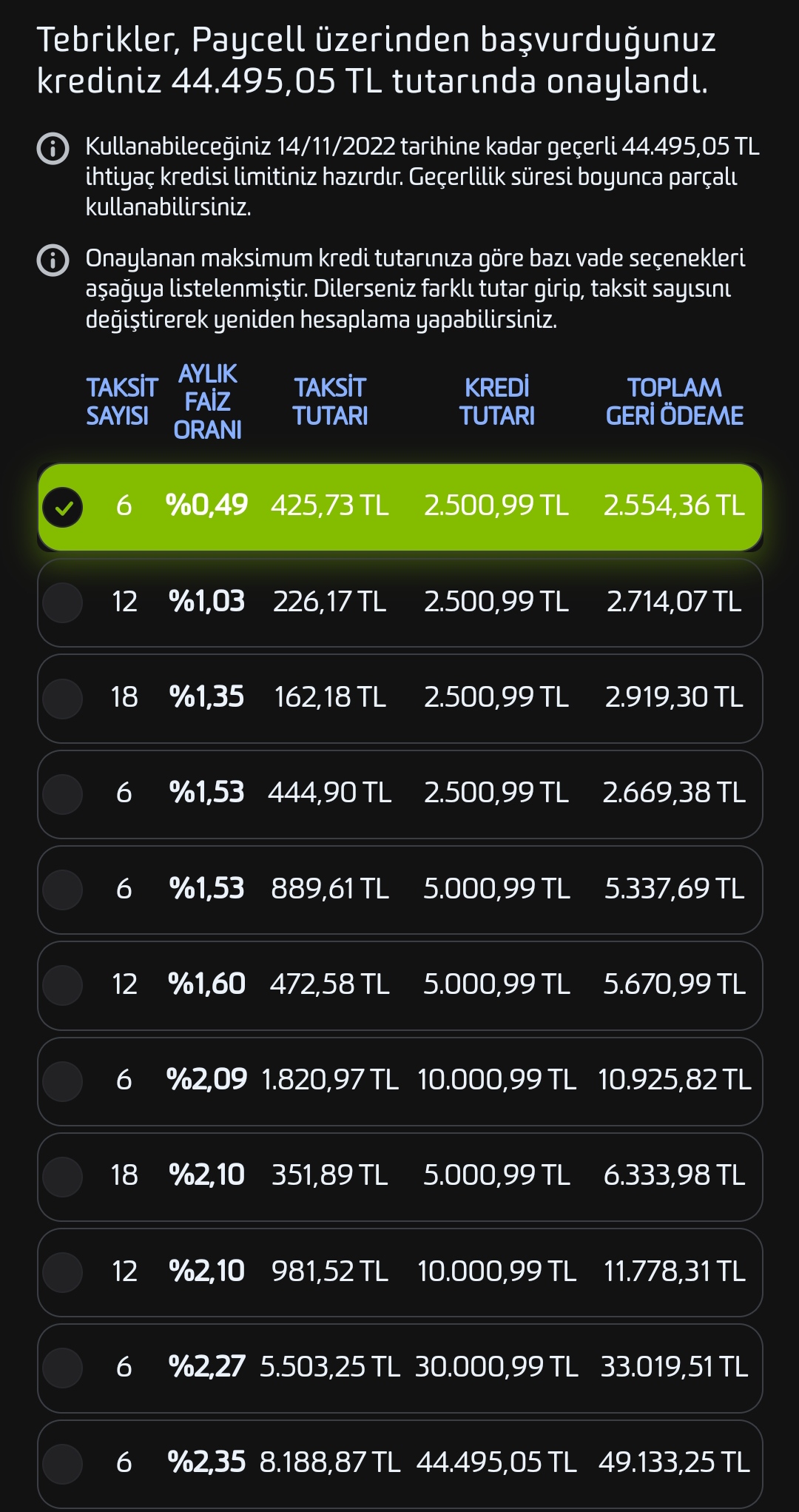 | Bende müşteri oldum döküman onayı kaldı ama kredi tutarı ve vadeyi değiştiremiyorum denemek için yapmıştım 20000 TL 6 ay vade bilen var mı ? |