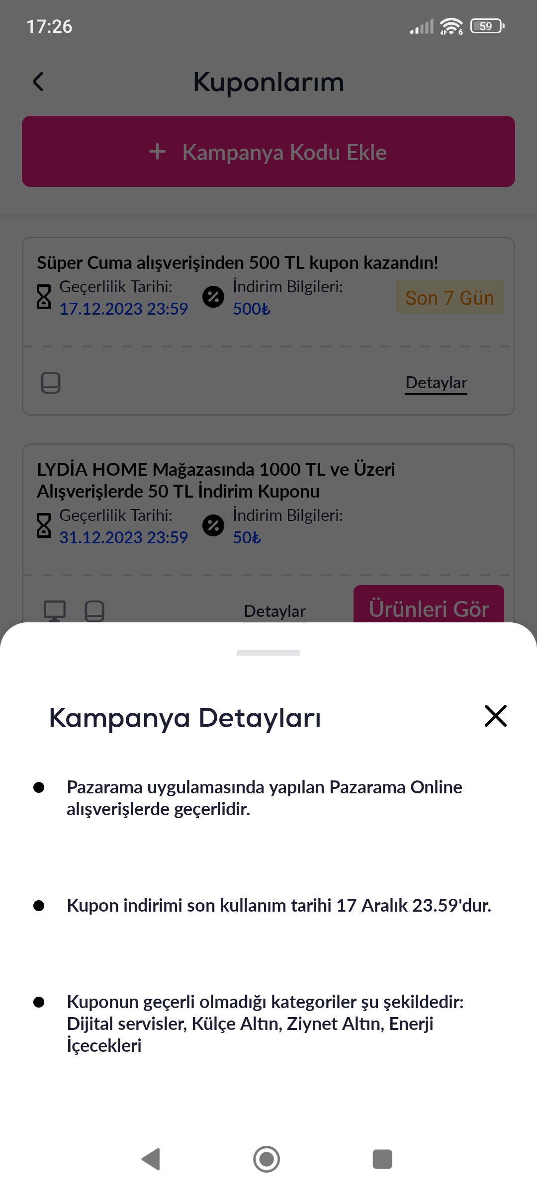 | 1070 lira alışveriş yaptım, ürünlerden biri tedarik edilemedi mesajı geldi şimdi. Haliyle 1000 liranın altında kaldım. Bu durumda hem kupondan hem de vakıf worldtan kombo gitti sanırım. |