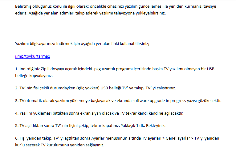 bu sabah yine uğraştım müşteri hizmetleriyle yeniden tv kurulumu yaptırdılar açıldı smart tv. bitti mi bakımınız dedim bitti dedi |