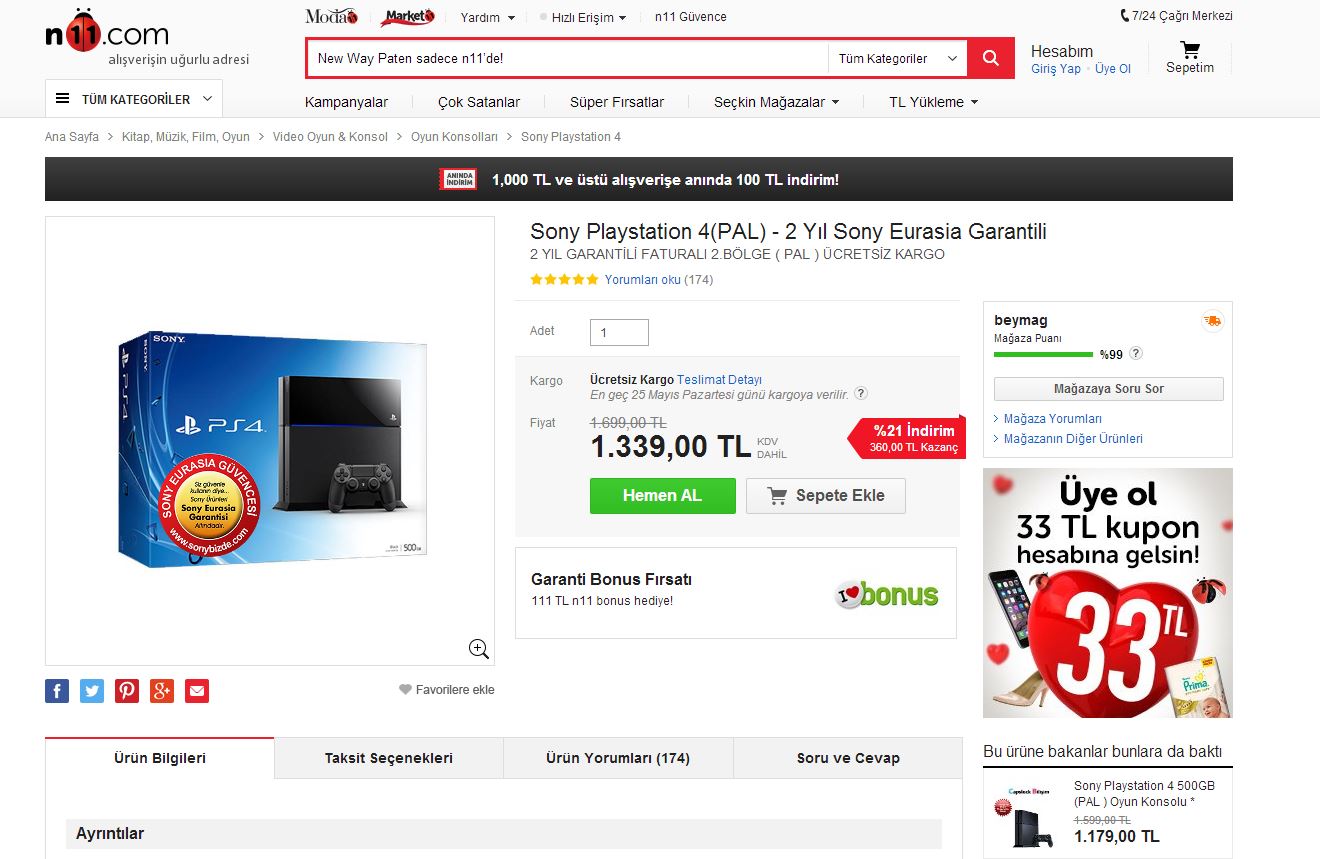 geçenler de n11 de 1339TL sony garantili vardı. (beymag) 100 TL anında indirim ve 111TL garanti bonus veriyordu. yani konsol : 1128TL ye geliyordu. şu ana kadar sony garantili daha düşük fiyat bulamadım. ben yetişemedim almak için ama kampanya her zaman çıkar. n11 i takip etmeni öneririm. < Resime gitmek için tıklayın > |