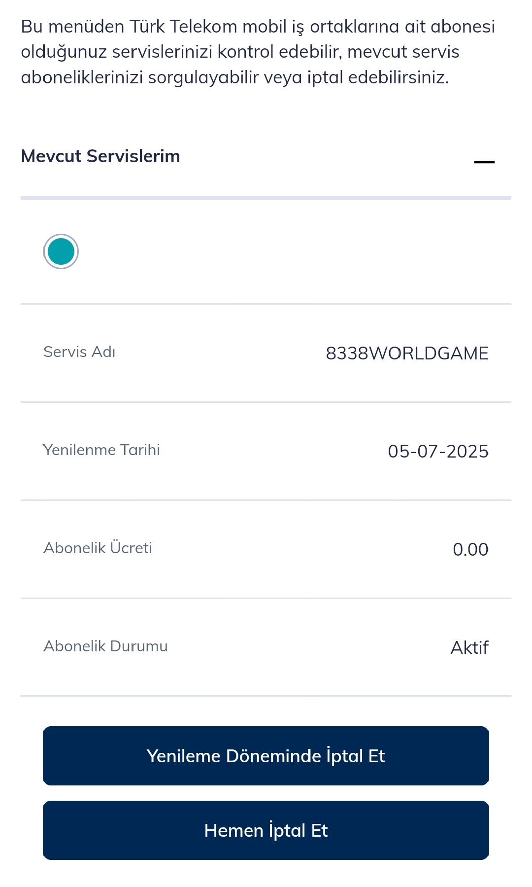 Hatta 2 tane abonelik oluşturulmuş.Sanırım sim menüsünden çocuklar yapmış.Bu servis alımını kapatabiliyormuyuz ? (aldıkta sonra iptal etme değil,hiç alamama) Mobil ödemeyi kapatsak bile bu servislere abone olunabiliyor mu ? < Resime gitmek için tıklayın >  |