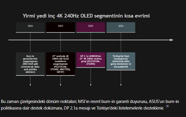 < Resime gitmek için tıklayın > Model bazlı değerlendirme ASUS PG27UCDM Bu model, “son teknoloji” hedefi için en net cevap: DP 2.1a UHBR20 (80Gbps) ile 4K 240Hz’i sıkıştırmasız hedefleyen mesajı, USB‑C 90W + KVM ve “OLED Care” araç setiyle birleşiyor. Artılar: DP 2.1a + HDMI 2.1 tam bant; USB‑C 90W ve KVM ile yüksek çok yönlülük; HDR’da 1000 nit sınıfı tepe parlaklık; çok düşük input lag. Eksiler: Glossy kaplama, bazı ortamlarda yansıma yönetimi gerektirebilir; OLED kaynaklı burn‑in riski tamamen sıfır değil; fiyatı Türkiye’de en yüksek bantta. Kimlere uygun: “Tek monitörde hem oyun hem üretkenlik/laptop” ve DP 2.1 ile daha uzun ömürlü bağlantı yatırımı isteyenler. MSI MPG 272URX QD‑OLED MSI tarafı, PG27UCDM’e en yakın “platform” alternatifi: DP 2.1a, USB‑C 90W, KVM ve çok güçlü hareket netliği/latency profili. Artılar: DP 2.1a + USB‑C 90W + KVM; HDR tepe parlaklık sınıfı çok güçlü; input lag çok düşük; burn‑in azaltma menüsü (Pixel Shift/Panel Protect) detaylı. Eksiler: Glossy; VRR flicker bazı sahnelerde rahatsız edici olabiliyor; güç/enerji tüketimi “on‑mode” değeri üretici sayfasında net değil. Kimlere uygun: PG27UCDM düzeyine yakın özellikleri genelde daha düşük fiyatla almak isteyen, USB‑C + KVM’yi gerçekten kullanacak kişiler. Dell Alienware AW2725Q Bu modelin “en mantıklı” olduğu yer, benzer panel sınıfında daha düşük fiyat aralığı ve Dolby Vision + eARC gibi niş ama değerli medya özellikleri. Ancak “en güncel teknoloji” kriterinde, DP 2.1 yok ve USB‑C video yok olması kırıcı. Artılar: Dolby Vision; eARC üzerinden ses aktarımı; çok düşük input lag; güçlü HDR tepe parlaklık. Eksiler: DP 1.4; USB‑C yalnızca veri + 15W (DP Alt yok); fabrika renk doğruluğu (pre) rakiplerine göre daha zayıf ve kalibrasyon ihtiyacı daha belirgin. Kimlere uygun: “Oyun + konsol/medya” karması yapan, Dolby Vision/eARC’ı değerli gören ve DP 2.1 / USB‑C görüntü ihtiyacı olmayan kullanıcılar. Samsung Odyssey OLED G81SF Samsung’ın farkı, QD‑OLED dünyasında mat kaplama ile “yansıma” tarafını agresif biçimde kontrol etmesi; bu sayede parlak ortamlarda ekranın “ayna” gibi davranmaması. Bunu, USB‑C eksikliği ve DP 2.1 olmaması karşılığında alıyorsunuz. Artılar: Mat kaplama ile çok güçlü yansıma kontrolü; HDR tepe parlaklık ve Real Scene değerleri çok iyi; üretici sayfasında “normal kullanımda burn‑in garanti kapsamında” ifadesi bulunuyor. Eksiler: USB‑C yok; DP 2.1 yok; “VRR Control” açıldığında giriş gecikmesi ciddi artabiliyor. Kimlere uygun: Mat kaplamayı özellikle isteyen, konsol/PC oyun odaklı kullanıcılar (laptop tek kablo öncelik değilse). Gigabyte MO27U2 Kâğıt üstünde çok “dolu” bir paket: resmi sayfada HDR sertifikası, fabrika kalibrasyon △E<2, hoparlör, USB‑C Alt Mode ve güç tüketimi gibi detaylar net. Ancak DP tarafı 1.4 ve USB‑C PD 18W ile sınırlı olduğu için “tek kablo laptop dock” hedefinde MSI/ASUS kadar iddialı değil. Artılar: Resmi teknik tabloda net port seti; USB‑C Alt Mode; 5W×2 hoparlör; 45W güç tüketimi bilgisi; fabrika kalibrasyonu (△E<2) ve kalibrasyon raporu. Eksiler: DP 1.4; USB‑C PD 18W; bağımsız ölçümle input lag / renk kapsamları (sRGB/Adobe) için daha az veri. Kimlere uygun: Dahili hoparlör ve resmi “paket” detaylarını önemseyen, DP 2.1 şartı olmayan ve USB‑C’nin sadece “bağla çalıştır + düşük PD” olması sorun yaratmayan kullanıcılar. Burn‑in, garanti ve uzun dönem risk yönetimi OLED monitörlerde burn‑in (kalıcı iz) riski “teorik” değil; özellikle çok statik arayüz (gün boyu görev çubuğu, aynı pencere düzeni, sabit HUD) senaryolarında zamanla görülebilir. Bu nedenle üreticilerin “panel bakım” özellikleri ve garanti kapsamı, satın alma kararında kritik hale geldi. Bu rapordaki modellerin ortak noktası, burn‑in riskini azaltmak için yazılımsal bakım döngüleri sunmalarıdır: