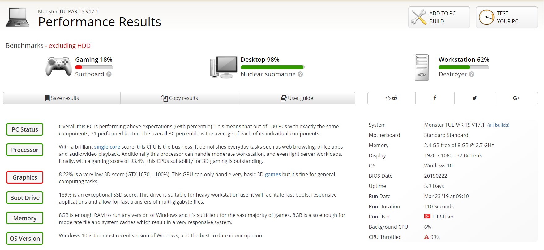 Merhaba geçen hafta aldığım tulpar t5 v17.1 modeline benchmark testi yaptığımda graphics bölümünde düşüklük gözüküyor. aynı modele sahip arkadaşımda düşük çıkmıyor sonuç. Bu olaylardan pek anladığım söylenemez o yüzden size sormak istedim. Ekran kartında herhangi bir arıza vs olma durumu var mıdır ? < Resime gitmek için tıklayın > |