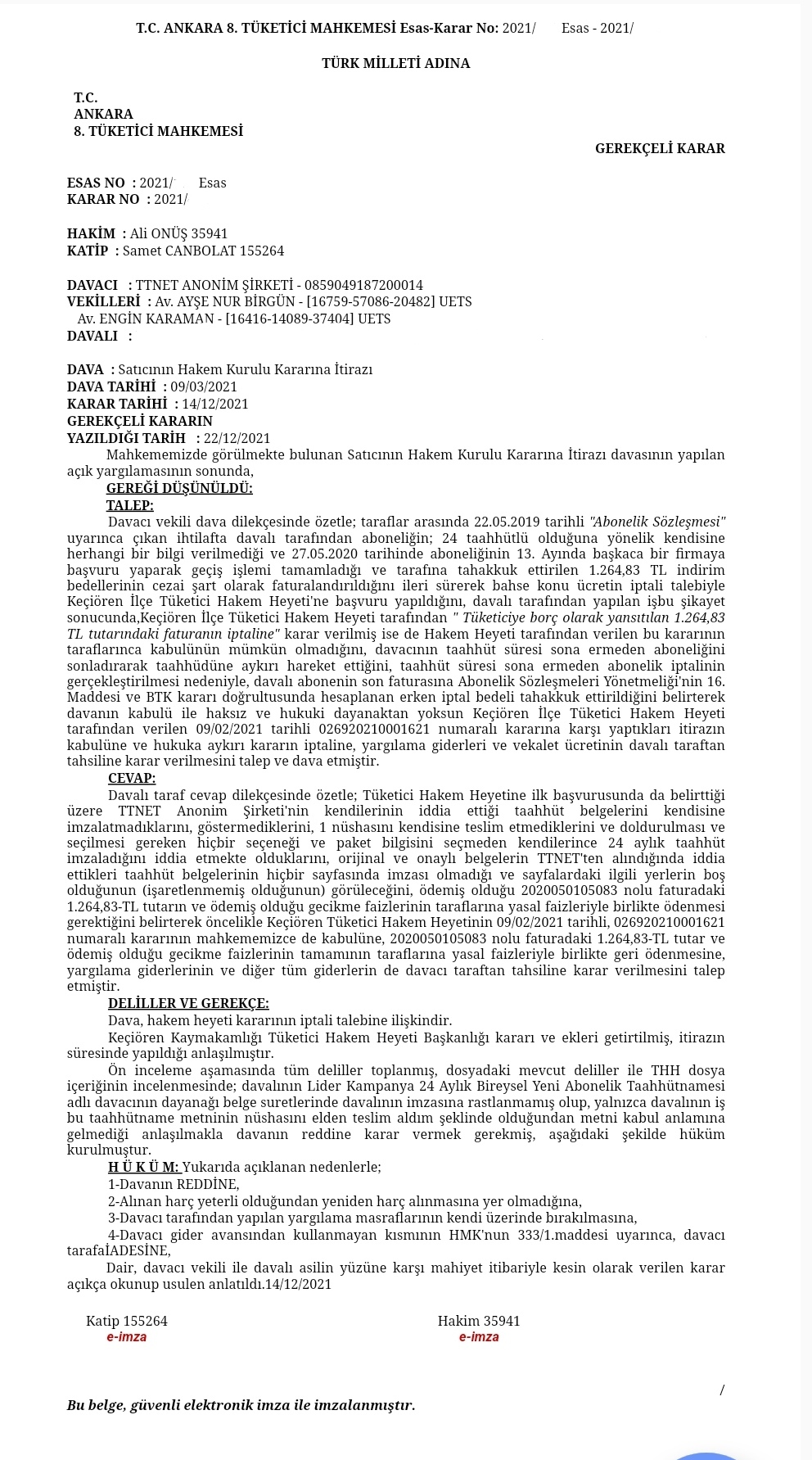 ÖNEMLİ NOT: Kararlarda gördüğünüz gibi bizim haklı bulunma gerekçemiz ortada gerçekten de taahhütnameye ait herhangi bir belge olmaması. Yani aboneliği yapan TTNET bayisi baştan savma bir şekilde formları almış ama imza atılması gereken taahhütname ve doldurulması gereken paket bilgisi vb. kısımları doldurmadan geçmiş. Ben de bu eksikliği fırsat bilerek hem bunun üzerinden hem de zaten 13. ayda olduğumuz için cayma bedeli ödemeden iptal edebileceğimin dayanağı ile başvurumu yapmıştım. Burada benim anladığım önemli sonuç şu: Ortada bir taahhütnamenin varlığı olmadığı için aboneliğin 12 aydan fazlası için bir işlem yapmayı gerektirecek bir durum oluşmadı. Yani eğer 24 aylık taahhütlü bir abonelik olsaydı o zaman 13. ayda iptal etme durumum devreye girerek bunun yasal olmaması dolayısıyla bir iptal durumu ortaya çıkacaktı, fakat hiç taahhüt olmadığı için zaten abonelik sözleşmesi 12 ayla sınırlı kalmış oldu ve THH ve mahkeme de zaten ortada bir taahhüt yok cayma bedelini iade et şeklinde bir karar almış oldu. Ben bu şekilde yorumluyorum.