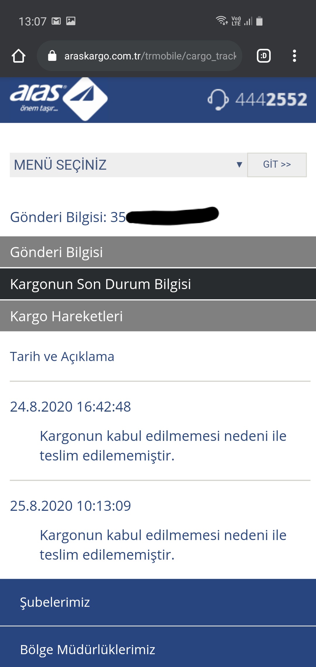 Ancak Aras kargo sayfasından ilgili numara ile sorgulama yaptığımda kargonun kabul edilmemesi nedeniyle teslim edilemediği açıkça görülmektedir.