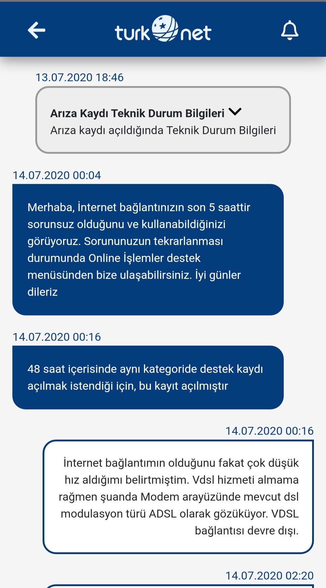 Müşteri hizmetlerine internet bağlantım olduğunu, sıkıntının yavaşlık olduğunu belirtmeme rağmen destek talebine gelen yanıt; interneti 5 saattir kullandığım, bir sıkıntı olmadığı oldu.