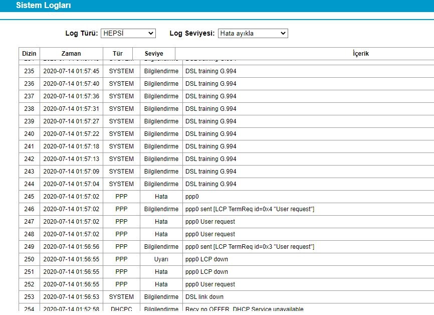 Dsl modulasyonunu vdsl2ye ayarladıktan sonraki log kayıtları;
