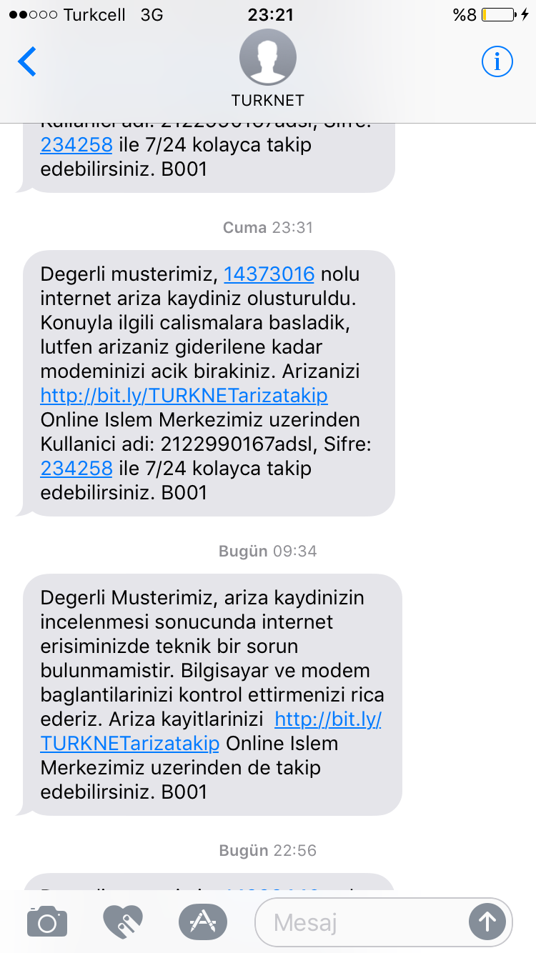 Öncelikle herkese merhaba. TürkNet serüvenim yaklaşık 3 ay önce 1 haziranda başladı. İnternetteki olumlu yorumlar kadar olumsuz yorumları bende gördüm ancak yine de başvurumu yaptım. Firmayla ilk sorunumu, ilk iki faturamın tarafıma iletilmesinden sonra yaşadım. Başvuruyu internet üzerinden yapıp kart bilgilerimi verip otomatik ödeme talimatı vermiştim. Ancak tarafıma yansıtılan ilk iki fatura, kart hesabımda herhangi bir sorun bulunmamasına rağmen ödenmemiş. Bankayla görüştüm kendileri tarafından herhangi bir sorun olmadığını söylediler. (Turkcell yaklaşık 3 senedir sorunsuz olarak bu karttan çekiyor faturalarımı.) TükNet'le olan görüşmemizde ise karttan tutarın çekilmeye çalışıldığını ancak ödemenin sağlanamadığını söylendi. Sorunu bankaya attılar ya da limit müsait değildir demeye getirdiler. Ancak burada bankada bir sorun olsa ya da limitim yeterli olmasa diğer faturalarım ödenmez. Sorun TürkNet tarafında gözüküyor. Bende uzatmadım faturanın son ödeme tarihinde eski talimatımı iptal ettim yeni talimat verdim ve ödeneceğini düşünüp konuyla daha fazla ilgilenmedim. Sonuçta talimatlı faturalar son ödeme tarihinde çekilir, bende talimatı tekrar son ödeme tarihinde verdim. Ancak yaklaşık 8 gün sonra tarafıma hattımın kullanıma kapatıldığı mesajı geldi. Yani faturalar ödenmemiş. Bende hemen uygulama üzerinden ve internet üzerinden Online İşlemler ile ödeme yapmayı denedim lakin ödeme işlemi sorun benim tarafımda olmadığı halde gerçekleştirilemedi. (Sistemsel hata verdi sürekli.) Daha sonra ödemeyi banka üzerinden yaptım ve TürkNet ile iletişim kurdum, tarafıma bir sonraki fatura da 24 TL açma kapama ücreti ve gecikme faizi uygulanacağını söylediler. Bende sorunun benim tarafımda olmadığını anlattım durumu izah ettim ancak bir şey yapamayacaklarını söylediler. Bende hizmetin iptali için dilekçeyi göndermelerini istedim doldurup geri göndermek için. 3 gün sonra TürkNet tarafından arandım iptal sebebimi sordular bende durumu izah ettim. Telefondaki kişi de bana mağduriyetimi gidermek ve iyi niyetlerini göstermek için 3 ay boyumca toplamda 90 TL lik bir indirim sağlayabileceklerini söyledi. 3 ay boyunca her ay faturama 30 TL indirim sağlayacaklardı. ilk ay 24 TL açma kapama ücreti yansıttılar. Yani bana 66 TL lik bir indirim sağladılar. Bende bu durumdan sonra dedim demekki TürkNet küçük hesaplar yapan bir firma değilmiş. Meblağ benim için önemli değildi yani 24 lira ne beni ne onları zengin eder. Lakin sorun bende değildi. Sorun bende olsa hiç sesimi çıkarmazdım zaten. Bu TürkNet'le yaşadığım ilk sorun ve TürkNet'in çözüm odaklı bir firma olma yolunda ilerlediğini gösteren bir adımdı benim için. Şimdi gelelim diğer kısıma sorunum gayet açık ve anlaşılabilir. 21 Ağustos tarihinden itibaren akşamları saat ortalama 21:00 ve 24:00 arası internet hızımda ve pingimde inanılmaz tutarsızlıklar yaşıyorum. Normalde 4 - 5 ms sabit ping alırken 100 lere 80 lere fırlıyor. Downloadım 45 - 48 arası çıkarken peş peşe yaptığım testlerde birinde 3 mbit çıkarken birinde 2 mbit birinde 20 mbit çıkıyor. Bu sorun için 21 Ağustos tarihinde arıza kaydı bıraktım. Ertesi gün mesaj attılar arızanız giderilmiştir diye. Ancak tabiki giderilememiş akşam tekrar aynı sorunla karşılaştım. Tekrar arıza kaydı oluşturmadım biraz bekleyeyim böyle bir sorunum yoktu belki altyapıda sıkıntı vardır şikayetler artınca düzeltilir diye üstüne düşmedim. Bazı günler sorunsuz geçerken bazı günler işkence gibiydi. Artık sorun kanser edicek düzeye gelmişiti suyu çıktı anlicağınız. Bende 7 Eylül tarihinde 2. arıza kaydını bıraktım. Ertesi gün aradılar sorununuz çözüldü hız değerleriniz normal diye. Akşam tekrar aynı durumu yaşadım tabiki de sorun çözülmemiş. 8 Eylül tarihinde 3. arıza kaydını bıraktım. Cuma gününe denk geldiği için 11 Eylül Pazartesi günü sabah aramışlar açamadım telefonu. Sonra SMS atmışlar "internet erişiminizde teknik bir sorun bulunamadı" diye. Ayrıca daha sonraki aramamda öğrendim sorun kullanıcının iç tesisatından kaynaklıdır diyip kaydı kapatmışlar. Defalarca belirttim iç tesisatımı kontrol ettim modemimi kontrol ettim sorun benden kaynaklanmıyor diye. İç tesisatımı TürkNet aboneliğine başlarken yani 3 ay önce yeni çektim ankastreden modeme kadar. Abonelik başlangıcında TürkTelekom'dan geldiler rica ettim anksatreden hızı ölçtüler sabit 50 mbit geliyordu. Tesisatta yine sorun çıkmasın diye CAT 6 NEXANS marka kablo kullandım tesisatı kendim yaptım jack larını bağlantılarını vs her şeyini kendim yaptım bu konularda gayet yeterli bilgiye sahibim. Modemi başka PC de test ettim yok hiç biyerde sorun yok. Ben bu interneti daha önce hız düşüşü yaşamadan alabiliyorsam. Neden 1 aydır alamıyorum? Neden bu soruna bir çözüm bulunmuyor? Müşteri hizmetlerini arıyorum ya telefon kesiliyor yarıda kalıyor ya da bana hep aynı şeyleri söylüyorlar. Önlerinde bir metin var aynı şeyler... Her aramamda güncelleme yapıyorlar hiç bir şey değişmiyor. Bugün gelen sorun bulunamamıştır mesajından sonra öğlen tekrar aradım müşteri hizmetlerini dedimki SMS gelmiş böyle böyle diye anlattım durumu hop telefon kesildi bir daha... Tekrar aradım anlattım yeni bir kayıt açın mesai saatlerinde bir teknisyenle görüşme şansım olur sorunu hep akşamları yaşıyorum sabaha kalıyor diye. Hat değerlerim normal olduğu için kayıt açamıyorlarmış. Akşam tekrar aradım anlattım tekrar telefon kesildi... Sinirden elim ayağım titrer hale geldim. Anlattım ve bu sefer başka türlü bir çözüm üretmelerini istedim yönetim birimine ya da yetkili birilerine bağlamasını istedim söylediklerine göre bu sefer benimle diğer 
