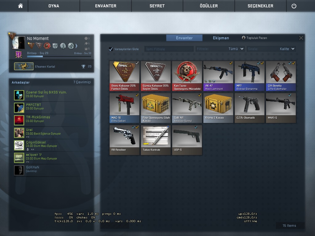 M4A1-S Cyrex Fabrikadan Yeni Çıkmış = 70TL Ak-47 Vulcan Görevde Kullanılmış = 70TL Stattrak P250 Mehndi Görevde Kullanılmış = 25TL Üçünüde alana fiyat 165 yerine 150TL Ödeme şekli Bursa içi elden veya Akbank havale/eft steam :http://steamcommunity.com/id/no_moment/inventory/ |