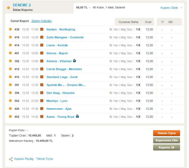 Her yolu denedik yazar takip ettik analiz yaptık kupon aldık en sonunda şansla alakalı olduğunu anlayıp sallamaya başladık iy0 4 maç yaptık ilk kuponumuz geldi arkadaşlarla para toplayıp şöyle bir kupon yapmayı planlıyoruz 2 maç tutsa yeterli herkez attığının 3 katını almış oluyor sizce gelir mi? NOT:Maçlar öylesine yazılmıştır kupon pazartesi oynanacaktır. OYNANMAYAN 1.KUPON < Resime gitmek için tıklayın > EDİT: oynamadığımız kupon gelmiştir.darısı pazartesiye inşallah < Resime gitmek için tıklayın > OYNANMAYAN 2.KUPON < Resime gitmek için tıklayın > EDİT: kupon yattı şöyle gözüküyorki 12 maçta 1 maç kesin < Resime gitmek için tıklayın > OYNANAN 1.KUPON Hadi hayırlısı tamamen salladık :D dün gece 12 maç çıkarmıştım sabah baktığımda 2 tanesi oynanmıştı ve 1i tutmuştu kafayı yiyecektim dün gece oynanmasaydı akşam oynansaydı 1 maçımız garanti idi ![]() 6 kişi bir kupona girdik tabi kimisi 5 kimisi 15 verdi hissesine ne düşüyorsa o kadar verilecek heycanlı oldu biraz :D bakıp görelim < Resime gitmek için tıklayın > EDİT: dün fıtık olduk maçlar hep ilk yarı geliyor maç sonucu aynı bitiyordu en son bir maç geldi ve kuponun son maçı gelip şans yüzümüze güldü oynadığımız ilk kuponda 196 TL geldi 500-1000 lirayı kaçırdık aslında diyebilirim herkez için hayırlısı bugün bir kupon daha attık hedef 3 maç :) < Resime gitmek için tıklayın > OYNANAN 2.KUPON tabi atılanın 3 mislisini alınca milletin hoşuna gitti bugün bir kupon daha yaptık bi 3 maç tutsa varyaaaa okul yıkılır :D hade eyv. bekleyelim ve görelim < Resime gitmek için tıklayın > EDİT: Resmen hunharca yattık yani başka açıklaması yok 12 maçtan sadece 2 tanesi ilk yarı 1 oldu 1/0 biten maç olmadı kısacası şans bizden yana olmadı :( |