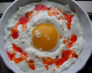 Çılbır..... Malzemeler ----- 4 yumurta 2 çay bardağı yoğurt 1/2 çay kaşığı tuz 2 diş sarımsak 3 Su bardağı su 2 çorba kaşığı sıvıyağ 1 çay kaşığı kırmızı tozbiber Yapılışı ---- Yumurtaları sarılarını patlatmadan önce bir kaseye kırın. Derince bir tencereye koyduğunuz su kaynayınca içine 1 çay kaşığı kadar tuz atın. Kasedeki yumurtaları yavaşca suyun içine salın. Eğer yumurtaların dağılmasından korkuyorsanız, yumurtaları büyükçe bir kepçe içine kırıp, kepçeyle hafifçe suyun içine koyun ki hiç dağılmamış olurlar. 2-3 dakika kaynatıktan sonra bir delikli kepçeyle servis tabağına alın. Yoğurdun içine sarımsağı ezerek karıştırın ve tuzunu ekleyin. Tabağa aldığınız yumurtaların üzerine yoğurtlu karışımı dökün. Servise almazdan önce, üstüne tavada kırmızı biberli yağ yakıp, gezdirin. www.nevigurme.com < Resime gitmek için tıklayın > < Resime gitmek için tıklayın > |