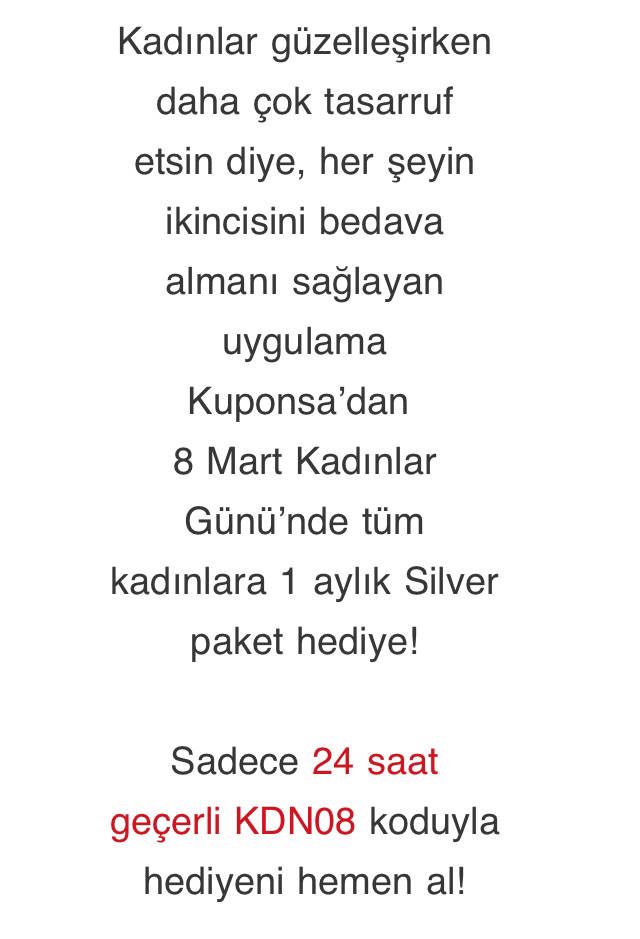 Kuponsa isimli uygulamada 1 aylık silver uyelik paketi tamamen ucretsiz. Bu gece 00:00 a kadar gecerli olan kodu uygulama icinde yazıp ucretsiz kullanimi hemen baslatabilirsiniz. Kod: KDN08 İyi forumlar.. < Resime gitmek için tıklayın > |