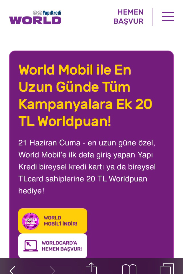 • World Mobil’e giriş yapmak için en az 1 adet Yapı Kredi bireysel kredi kartı ya da bireysel TLcard’a sahip olunmalıdır.