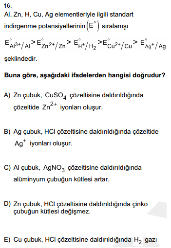 < Resime gitmek için tıklayın > Soruda indirgenme eğilimini vermiş bize aktiflik lazım o yüzden tersini aldığımızda Cu , Zn den daha aktif oluyor fakat doğru cevap olarak A şıkkı demiş. Çözeltideki cu daha aktifse Zn çubuk nasıl aşınıp Zn+2 yi oluştursun ki anlamadım yardımcı olabilir misiniz ? |