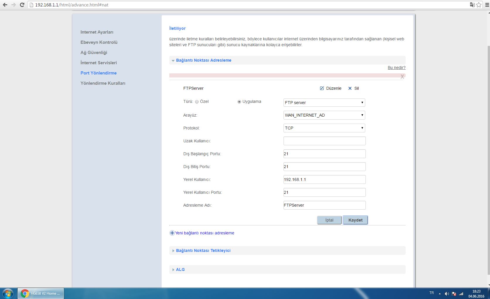 Arkadaşlar modemim huawei hg658 v2 modemime usb flash bellek bağlayıpftp://192.168.1.1 adresinden flas belleğimdeki dosyalara ulaşabiliyorum ancak local ağ dışında uzaktanftp://ipadresim şeklinde bağlanamıyorum, biraz araştırdım 21 port açılması gerekiyormuş ancak ben bu portu açmak istediğimde foto da görüldüğü gibi kaydedemiyorum bu konuda yardıma ihtiyacım var < Resime gitmek için tıklayın > |