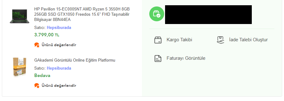 20.02.2020 tarihinde hepsiburada.com üzerinden satıcısı hepsiburada olan bir notebook aldım,
