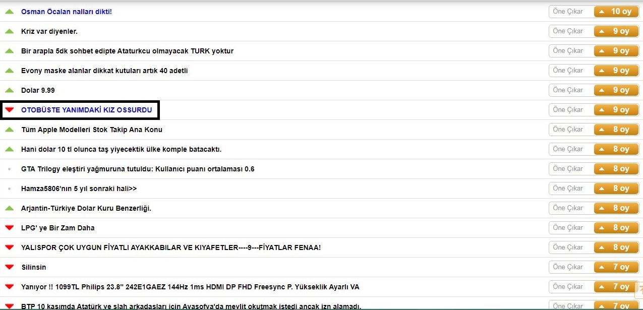 Aptal saptal konuların öne çıkarılmasından ve bunun ana sayfaya düşmesinden bıktım. Ya konunun üzerine fareyle gelince X işareti çıksın ki saçmalıkları kapatalım ya da mesajlar geriye atıla atıla ana sayfadan indirilsin. Koskoca forumda o....k muhabbeti mi olur bu nedir? < Resime gitmek için tıklayın > |