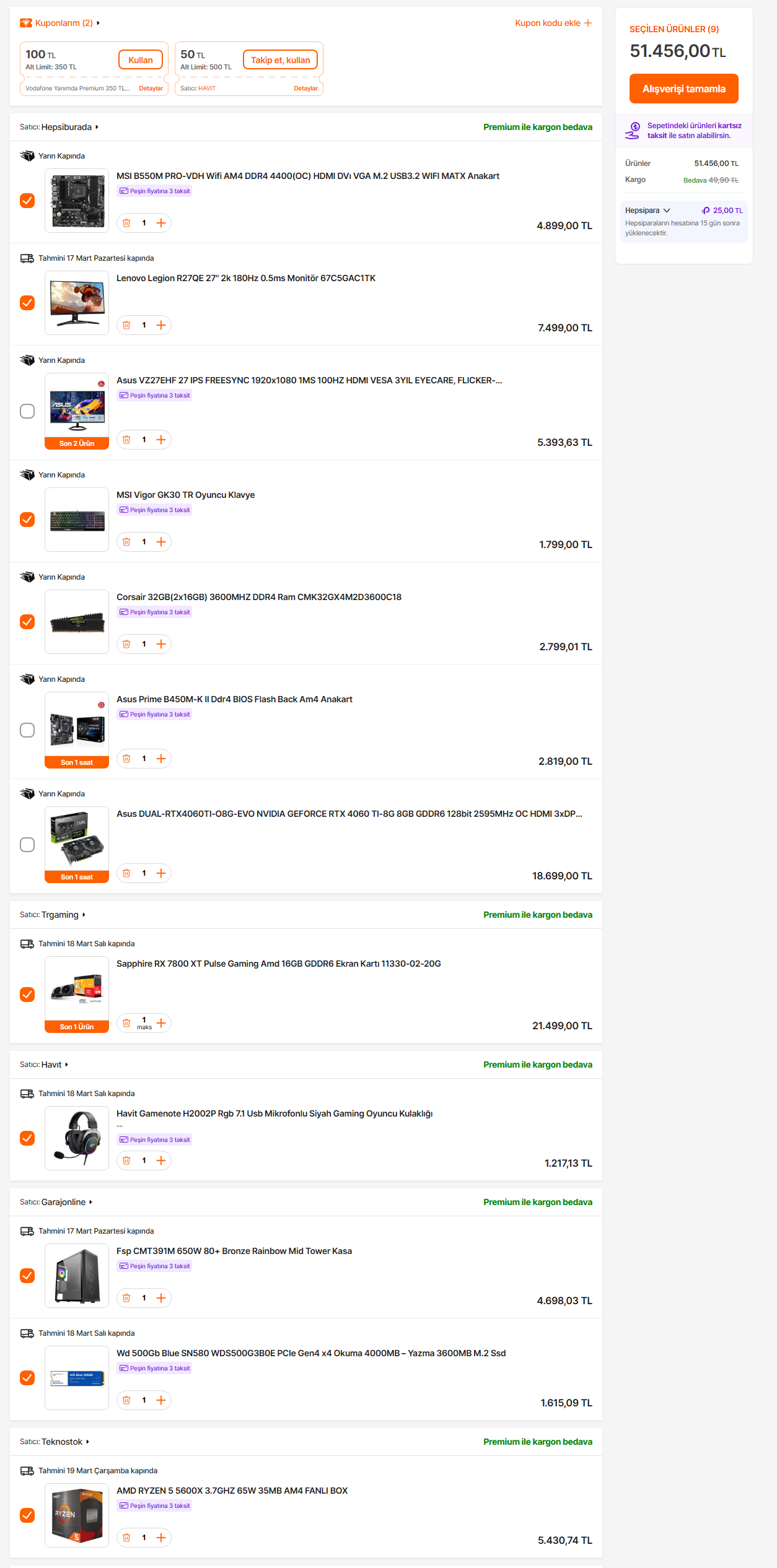 Bütçem 50K ama az daha koyup kalite/performans artışı alacaksam biraz açılabilirim. Ürünler Hepsiburada' üzerinden alacağım, kartıma 9 taksit veriyor. Aşağıdaki gibi bir sistem oluşturdum, işlemci biraz zayıf kaldı galiba ama sıvı soğutma konusunda pek bilgim olmadığı için sıvı soğutma isteyecek bir sistem dizmedim. Hazır sistemler var beğendiğim fakat taksite çok fazla vade farkı geliyor avantajı kalmıyor. Yine de vade farkına rağmen daha iyi olacağını düşündüğünüz hazır sistem varsa yorumlarınızı bekliyorum. Tüm bankaların kartı var diyebilirim. Tavsiyelere açığım, teşekkürler şimdiden. < Resime gitmek için tıklayın > Notlar;