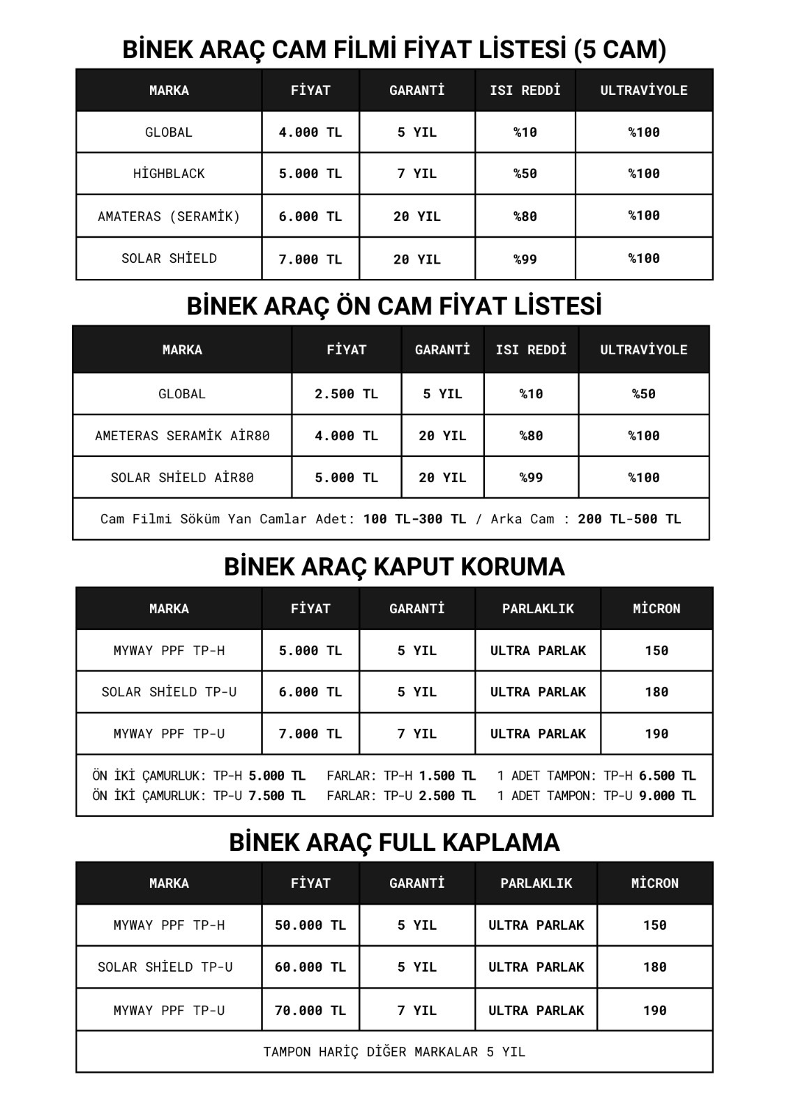 Arkadaşlar foruma özel 5 yıl garantili Global cam filmi 4000₺ (%10 ısı reddi) 20 yıl garantili Amateras ceramic cam filmi 6000₺ (%84 ısı reddi) Fiyat kampanyası başlatıyoruz. 50 araçla sınırlı kampanyadan faydalanmak için 0312 251 22 51 üzerinden randevu alabilirsiniz. Amateras Ceramic film hakkında 10 yıldır Forumda bu filmle tanışmış yüzlerce müşterimiz mevcut. 20 yıl garanti veriyoruz. 10 yıldan fazladır kullandığımız, Fiyat/Performans oranı piyasadaki en yüksek cam filmi. %99 UV korumalı kalitesini ispat etmiş bir film. %84 ısı reddi piyasadaki en iyi filmlerden. Ölçüm cihazıyla test edebilirsiniz. Standart otomobil 5 cam için 6000 TL fiyat geçerlidir. Stok: Isı reddi nedir? Cam filminin güneş ısısını engelleme oranıdır. Aynı ışık geçirgenliginde ısı reddi yüksek film daha fazla ısı koruması sağlar. Arabanız daha az ısınır. Örneğin %35 dediğimiz ışık geçirgenligi orta olan 2 numara diye tabir edilen ısı reddi düşük film, 1 numara %50 ışık geçirgenligine sahip ceramic filme göre daha fazla Aracın içinin ısınmasını neden olur. Özetle görüş kaybı minimum olan açık tonlu seramik film kullanarak koyu filme gerek kalmadan aracı ısıdan daha iyi korursunuz. Markası bilinen yüksek fiyatlı filmlerde ısı reddine dikkat edin. Çoğu filmin ısı reddi çok düşüktür. Dikkat : Film ısı reddi ölçümleri ve uv koruma oranları elimizde bulunan cihazla olculmektedir. Montaj öncesi kendi örnek filmimizi ve bizim ürünlerimizin ölçümlerini kendiniz yapabilirsiniz. Emr Garage Ankara 0 (312) 251 22 51 Acity Avm arkası Batı Bulvarı 177.cadde no 19 Batı iş merkezi < Resime gitmek için tıklayın > |