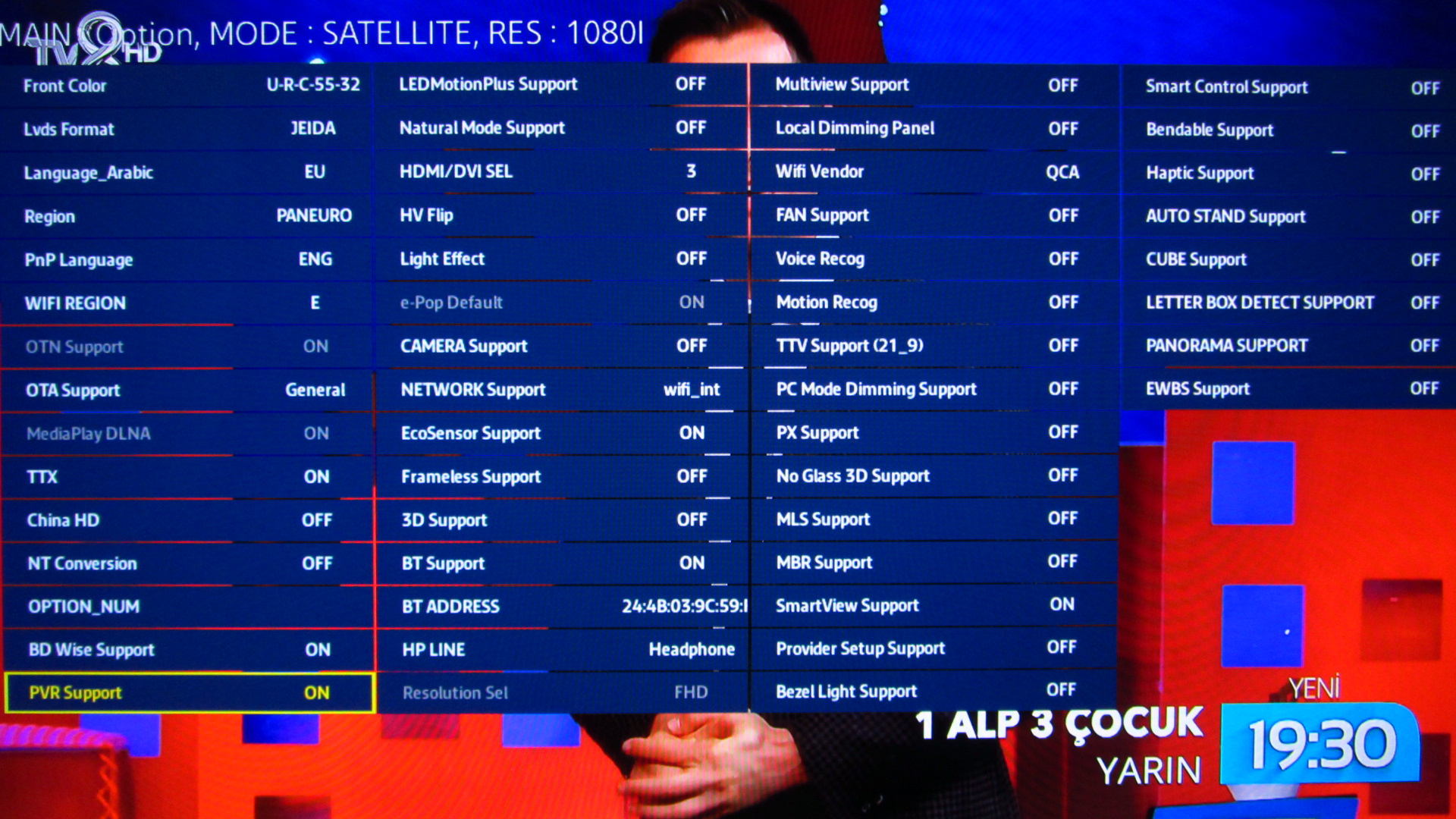 Options / MRT Options menüsüne giriyoruz. Burada PVR seçeneğinizi ON yapıyoruz. Bu şekilde PVR fonksiyonunu aktif ettik. Ancak asıl sorun bundan sonra başlıyor. Televizyonu kapatıp açınca bu ayar tekrar OFF oluyor. Bunu engellemek için LOCAL_SET ayarını EU olarak değiştiriyoruz. Menü dillerinin ingilizce olmasını engellemek için de LANGUAGE_ARABIC seçeneğini Turkey yapıyoruz.Televizyonu kapatıp açıyoruz ve PVR ve Timeshift özellikleri kullanılabilir duruma geliyor.