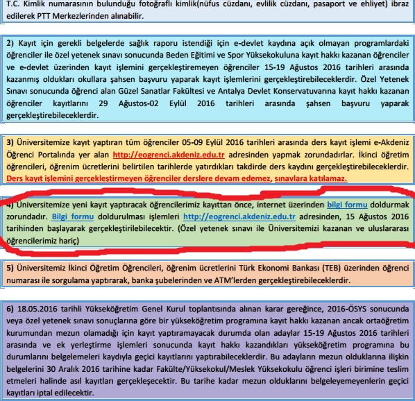 Arkadaşlar şimdi e devletten kaydı yaptım. Barkod numarası ile sorgulama yaptım , oda tamam. Şimdi bundan sonra yapılacak birşey varmı? Birde gözüme şu takıldı. Akdeniz üniversitesi sayfasında şu resimde kayıt yaptıracak öğrencilerimiz "KAYITTAN ÖNCE" bilgi formunu doldurmak zorundadır diyor.Biz kaydı E-Devletten 12 Ağustos'da yaptık bunuda doldurmamıza gerek varmı acaba ? < Resime gitmek için tıklayın > |