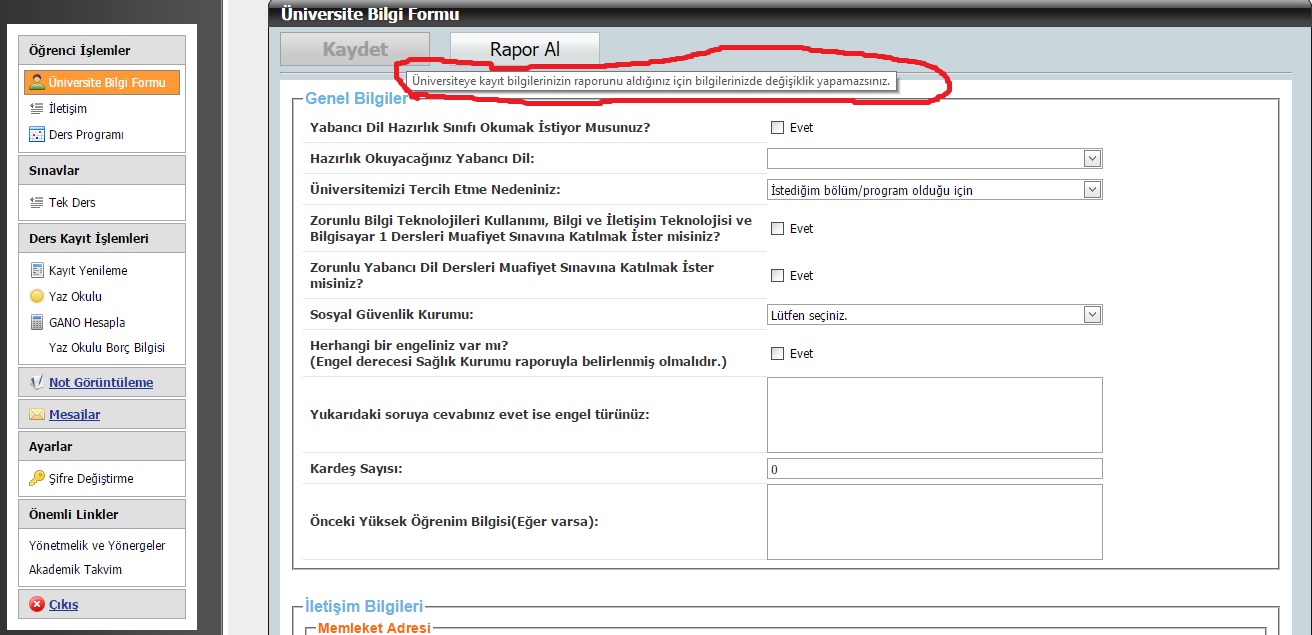 Arkadaşlar kısaca özetliyim fazla uzatmadan.Akdenizi kazandım. E-Devletten üni kaydını yaptım. Çıkan belgenin barkodunuda sorgulattım buraya kadar sorun yok. Akdenizin sitesine girerken şunu gördüm. 4.Başlıktaki yazıyı.(Galiba bu e-devlet haricinde üniversiteye gidip kayıt yaptırmak isteyenlerin doldurması gereken bir belge imiş.Öyle değil ise biri söylesin) < Resime gitmek için tıklayın > Sonra girdim formu doldurayım dedim, daha tam ne olduğunu bilmeden. Öğrenci bilgi sayfama girdim.Üniversite bilgi formuna girdim. Burda Form vardı ve "KAYDET" ve "RAPOR AL" tuşları vardı. Formu doldurmadan direk "RAPOR AL" tuşuna bastım karşıma direk PDF dosyası çıktı, yazıcıdan çıkartmak için.Galiba bu üniversite kaydına giderken götürmek gerekiyormuş. Sonra geri form doldurma yerine geldim fakat form doldurulmuyor. Resimdeki gibi Rapor Aldığınızdan bilgileriniz değiştirilemiyor diyor. < Resime gitmek için tıklayın > Kaydet tuşuda kapalı.Bunu nasıl düzelteceğim şimdi? Böyle kalsa bi zararı olurmu? Ben normal E-Devletten yaptım kaydımı. Siteden girip çıkıncada form değiştirilemiyor? Bilen biri yardımcı olabilir mi? |