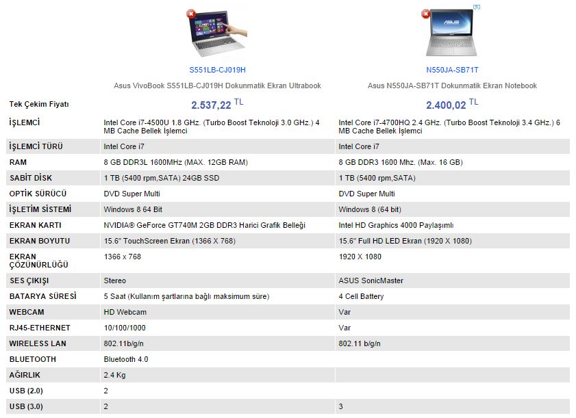 Arkadaşlar 2 notebook arasında kaldım ve fikirlerinize ihtiyacım var. (iki notebook'un özellik kıyaslamasını aşağıdaki resimde veriyorum) Birisi Asus N550JA-SB71T Dokunmatik Ekran Notebook --->http://www.istanbulbilisim.com.tr/asus-n550ja-sb71t-dokunmatik-ekran-notebook-fiyati,135577.html#ProductTechnicalProperties Diğeri Asus VivoBook S551LB-CJ019H Dokunmatik Ekran Ultrabook --->http://www.istanbulbilisim.com.tr/asus-vivobook-s551lb-cj019h-dokunmatik-ekran-ultrabook-fiyati,106831.html Birincisinin tek kayda değer artısı FULL HD olması. Diğerinin ise işlemcisi biraz düşük olmakla birlikte 24 GB SSD'si var ve ekran kartı daha iyi. Burada en önemli sorum FULL HD çok önemli bir şey mi? full hd almasam pişman olur muyum? Bu konuda fikirlerinizi paylaşırsanız çok memnun. < Resime gitmek için tıklayın > |