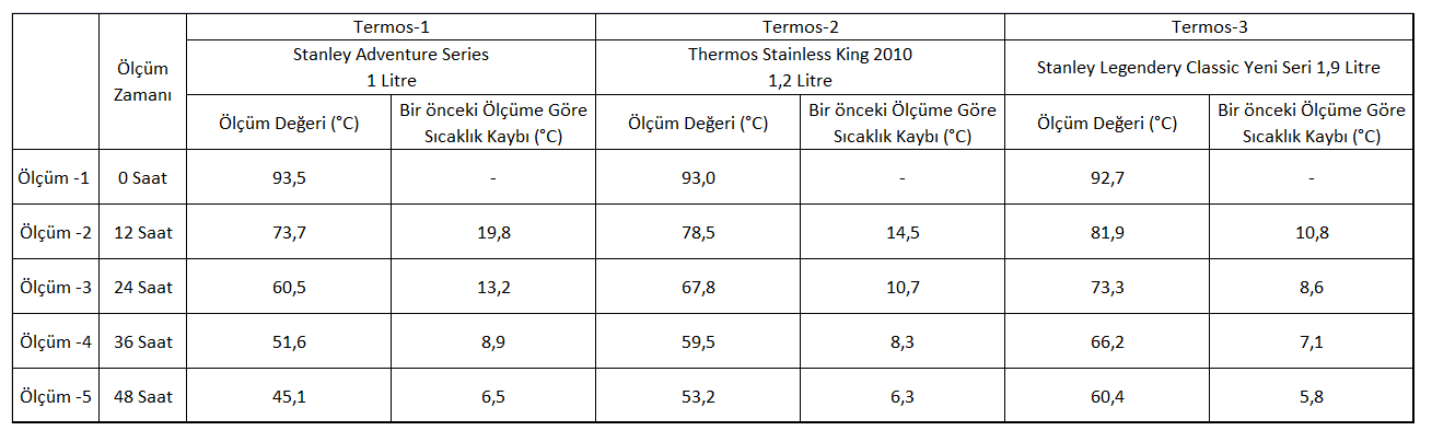 Forumda zaman zaman termos tartışmaları oluyor bende denk geliyorum, bunun üzerine elimdeki termoslar ile bir sıcak içecek performans kıyaslaması yapmak istedim. Hatta bazen Thermos mu iyi Stanley mi iyi tartışmaları oluyor bence bu iki markada bu işin tartışmasız en iyileri. Bazı insanlar ucuz termoslarda aynı işi yapıyor diyor keşke elimde ucuz bir termos olsaydı da onuda katsaydım karşılaştırmaya ama bir tane Lipton vardı onuda verdik gitti birisine. Bilgilendime açısından teste katılan tesmosların hepsi yeni alınmış. en eski olanı (thermos 1,2 Lt) 3-4 defa kullanılmıştır. Bu arada okuyan insanlar ne gerek var bu sürelere 8 saat bile iş görmez mi, veya bende de aynısı var okadar uzun sıcak kalmıyor diye soracaktır. Bu süreler ideal şartlardaki sürelerdir sizin günlük kullanımdaki daha soğuk hava koşulları, her kapak açmanız içerisinden sıvı almanız (yerine soğuk hava dolması) bu süreyi yarı yarıya kadar düşürebileceğini unutmayın. Testleri yaparken termosların içini yaklaşık olarak eş miktarda sıcak su ile çalkaladım ve 15 dakika kadar ilk sıcak su ile saklayıp bu ısıtma suyunu boşalttım. Bunu yapmamadaki amaç karşılaştırmanın sağlıklı olması aksi taktirde daha büyük olan termos çelik kalınlığı fazla olan termos ilk konan sudan daha çok ısı soğurarak performansın farklı oranda düşmesine sebep verecektir. Bununla birlikte ağılarını çok sıkı kapatmaya dikkat ettim. Ölçüm yaparken ağızlarını açarak çubuk termometre ile ölçüm yaptım, termometre stabil sıcaklık gösterene kadar ısı kaybını engellemek amacıyla termos ağızını 5-10 peçete ile kapattım. Bu arada gönül isterdi ki aynı kapasiteleri kıyaslayalım ama elimde olan ürünler bunlar. Şunu unutmayın ki kapasite arttıkça performansta artmaktadır. Gel gelelim teste katılan termoslara ve termoslar hakkındaki yorumlarıma: 1- STANLEY Adventure Serisi 1 Litre: BIM'de 175 TL 'ye satılan kutup ayısının getirdiği Adventure serisi termos. Adventure serisinin farkı ne diye sorarsanız biraz sanırım duvar kalınlığı bireaz daha ince, böylelikle kalsik seriye göre daha hafif ama tabi çarpma ve düşmelere karşı daha dayanıksız denilebilir. Bu kesinlikle kaltesiz anlamına gelmiyor, yine de piyasada bulabileceğiniz diğer termoslardan kat kat sağlam. Muhtemelen trekking yapan kullanıcıların Stanley iyide çok ağır yorumları üzerine çıkarttığı bir seri bu Advebture serisi, ki yabancı forumlarda bende bu gibi yorumlar okumuştum. Ağız kısmından çelik kalınlığını kumpas ile ölçtüğümde 1mm gibi bir kalınlık değeri okudum. Kesinlikle oldukça güzel bir ürün tutamaç olmamasının hafifliğe ve taşırken sessiz olmasına fayda var ki tek elle rahat kavranabilen bir yapısı var tutamaç bu boy için çokta gerekli değil. Stanleyin en beğendiğim yönlerinden olan (sadece yeşil renkte bulunan) o portakal kabuğu kaplamalı boyası rahat kaymayan iyi bir kavrama sağlıyor zaten. İdda ettiği perfomansa gelince 24 saat sıcak tutabildiğini idda ediyor. İçilebilir seviyenin 60 derece olduğunu düşünürsek (kimisi 55 dereceyide içebiliyor bence alt limit 60 derecedir) bu iddasını da karşılıyor diyebiliriz. Başlangıç sıcaklığının 93,5 derece olması ve 12. saat denemesi için kapak açmama rağmen 24 saat sonra 60,5 derece ile vaadini karşıladı. Daha yüksek bir başlangıç sıcaklığı ile vaadinden birkaç saat daha fazla iş görebilir. Normal saha kullanımı şartlarında çok rahat 8-10 saat gibi kullanılabilir süreler verecektir. Ağırlığı: 645 Gram Ağız kısmı çeliği et kalınlığı: 1mm 2- THERMOS Stainless King 2010 1,2 Litre: Evet bazıları bu termos için termosların kralı diye söze ediyorlar haksız da değiller. Boyuna göre performans açısından testin galibi denilebilir. Ürün hakkında söyleyebileceğim tek kötü yan tutamaç kısmı. Bir çok kiide eleştrimiş bunu zaten hem şangur şundur çok ses yapıyor hem de döküm sırasında sadece tutamacı kavrarsanız çok stabil durmuyor, elinizi tutamaç ile şişe arasından geçirip rahat döküm yapabiliyorsunuz ama ince bir el bir bayan bunuda bukadar rahat yapamayabilir. Ürün ağız kısmında 0,9mm et kalınlığına sahip bence gayet yeterli bir değer. Kimisi için ben çok düşürüyorum daha kalını şart diye düşünebilir ama termosu taşıyan kullanıcılar içinde et kalınlığı gereksiz ağırlık anlamına geliyor. Zatn ağırlık olarak 1 litrelik Stanleyden sadece 45 gram daha ağır. Kullanılan tutamaçın 60-70gr olduğunu düşünürsek 1,2Lt olmasına rağmen 1 Litrelik Stanley den daha hafif. Sıcak tutmaperformansına gelince ürün harikalar yaratıyor. İdda eettiği süre 24 saat, içilebilir sıcaklığı 60 derece olarak kabul ettiğimizde başardığı süre başardığı üsre ise 36 Saat.. Vaadettiği süreden 12 saat fazla hatta tam 1,5 katı. 36 saat sonunda 59,5 derece sonucu verdi, 93 derece olan başlangıç sıcaklığı biraz daha yüksek olabilseydi, 12 ve 24 saat ölçümleridne ölçüm sırasındaki kaybı düşünürsek 36 saat sonunda çok rahat bir şekilde 60 derece sıcaklığı sunabileceğini söyleyebiliriz. Kısacası performans olarak testin boyut/performans galibi. Boyundan büyük işler becerebilen bir ürün. Ayrıca hafifliği ile taşıyarak yürümesi gereken vb. kullanıcılar içinde başka bir artı. Almadan önce araştırdığım ve okduduğum yorumlar elde ettiğim sonuçları doğrular nitelikte. O sebeple çokda şaşırmadım, sıcak tutma performansı ve hafiflik isteyen kullanıcıların kesinlikle listesinde 1 numarada olmalı. Ağırlığı: 690 Gram Ağız kısmı çeliği et kalınlığı: 0,9 mm 3- STANLEY Legendary Classic Serisi 1,9 Litre (Yeni Seri - 2019): Bu ürün içinde Efsane Termos diyorlar ki dedikleri kadar varmış. Özellikle yeni seri diy