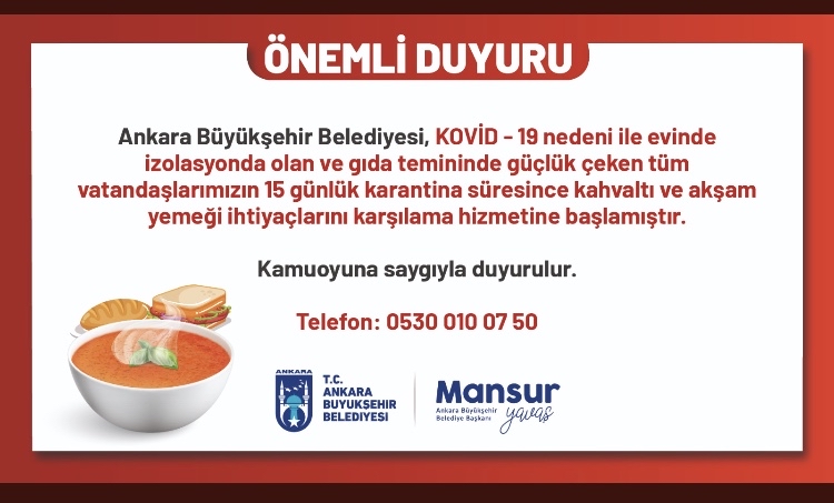 Ankara Büyükşehir belediyesi covid nedeniyle karantinada olanlara evlerinde kahvaltı ve akşam yemeği hizmeti başlattı. < Resime gitmek için tıklayın > |