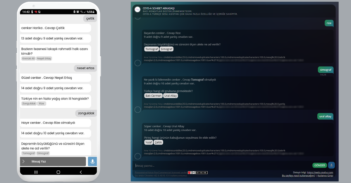CEYD-A, etkileşimli olarak soru sorabilir ve vereceğiniz cevapları değerlendirebilir. Bu şekilde sesli ve konuşarak CEYD-A ile sınav gerçekleştirilebilir. < Resime gitmek için tıklayın > Kod yazmadan, sadece aşağıdaki satırları ekleyerek kendi sınavlarınızı da oluşturabilirsiniz. Her satırda ; ile ayrıştırılmış soru, seçenekler ve cevap üçlüsünü yazmak yeterli olacaktır. Örnek: Depremin büyüklüğünü ve süresini ölçen alete ne ad verilir?;Tomograf!Simograf;Tomograf; Türkçe hangi dil grubuna girmektedir?;Batı-Cermen!Ural-Altay;Ural Altay; https://kodla.ceyd-a.com sitesinden giriş yaptıktan sonra. CEYD-A’yı açıp güncelle demeniz yeterli olacaktır. genel kültür soruları sor dediğinizde görseldeki gibi soruları cevaplamanız mümkün olacaktır. Bitti dediğinizde sınav sonlanacaktır. SORU: genel kültür soru set 1 CEVAP: Depremin büyüklüğünü ve süresini ölçen alete ne ad verilir?;Tomograf!Simograf;Tomograf; Türkçe hangi dil grubuna girmektedir?;Batı-Cermen!Ural-Altay;Ural Altay; Pirinç hangi ürünün kabuğunun soyulması ile elde edilir?;Yulaf!Çeltik;Çeltik; Bozkırın tezenesi lakaplı rahmetli halk ozanı kimdir?;Kıvırcık Ali!Neşet Ertaş;Neşet Ertaş; Türkiye nin en fazla yağış alan ili hangisidir?;Zonguldak!Rize;Rize |