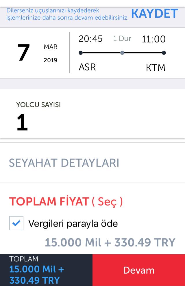 15000 mil + 330 tl vergi. (Ör: Van-İst-Katmandu, Adb-İst-Katmandu, Tzx-İst-Katmandu, gibi)