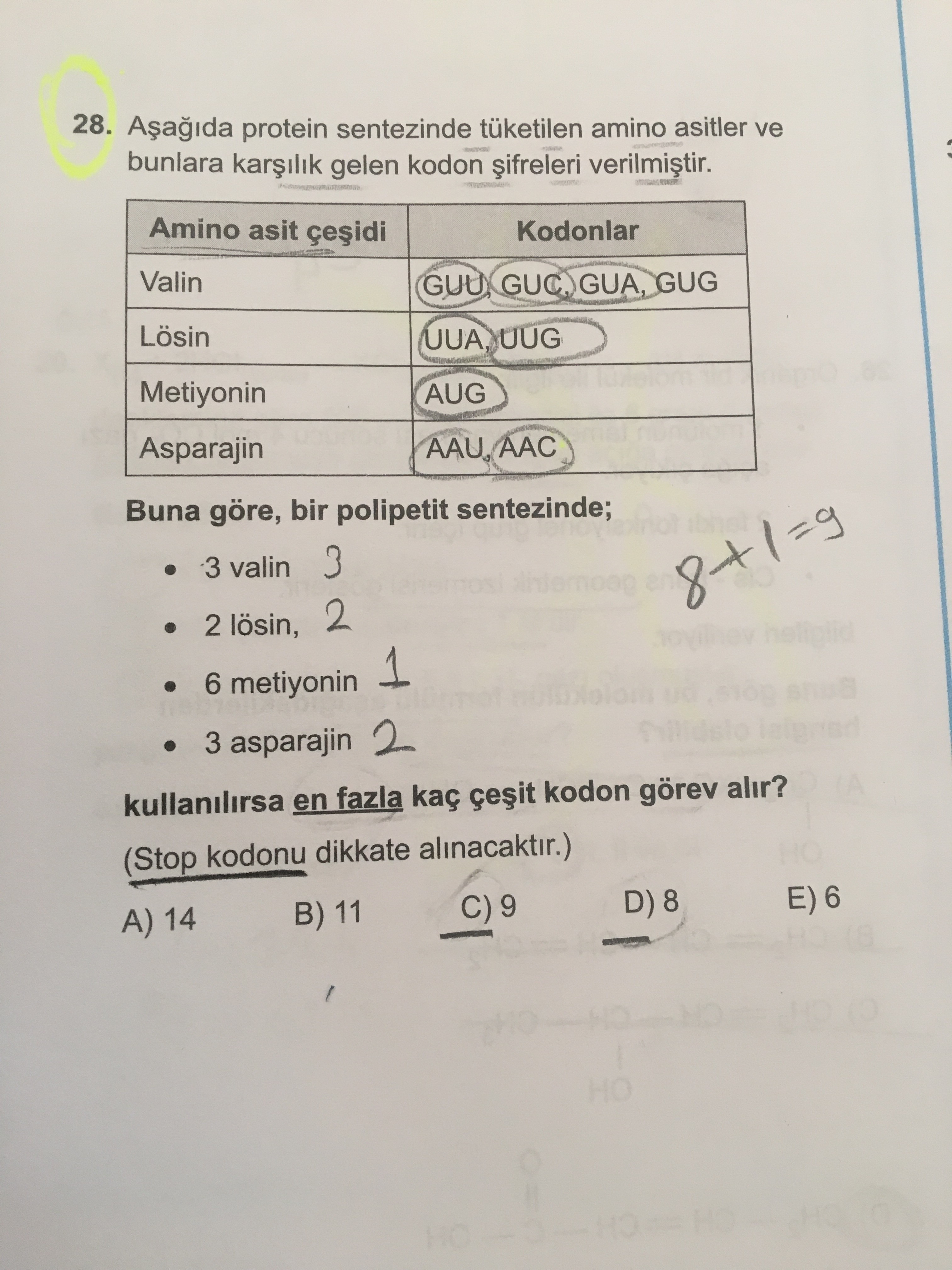 Stop kodonu aminoasit getirmez. O yüzden cevabın 9 olması gerekmiyor mu ? Cevaba d diyor < Resime gitmek için tıklayın > |