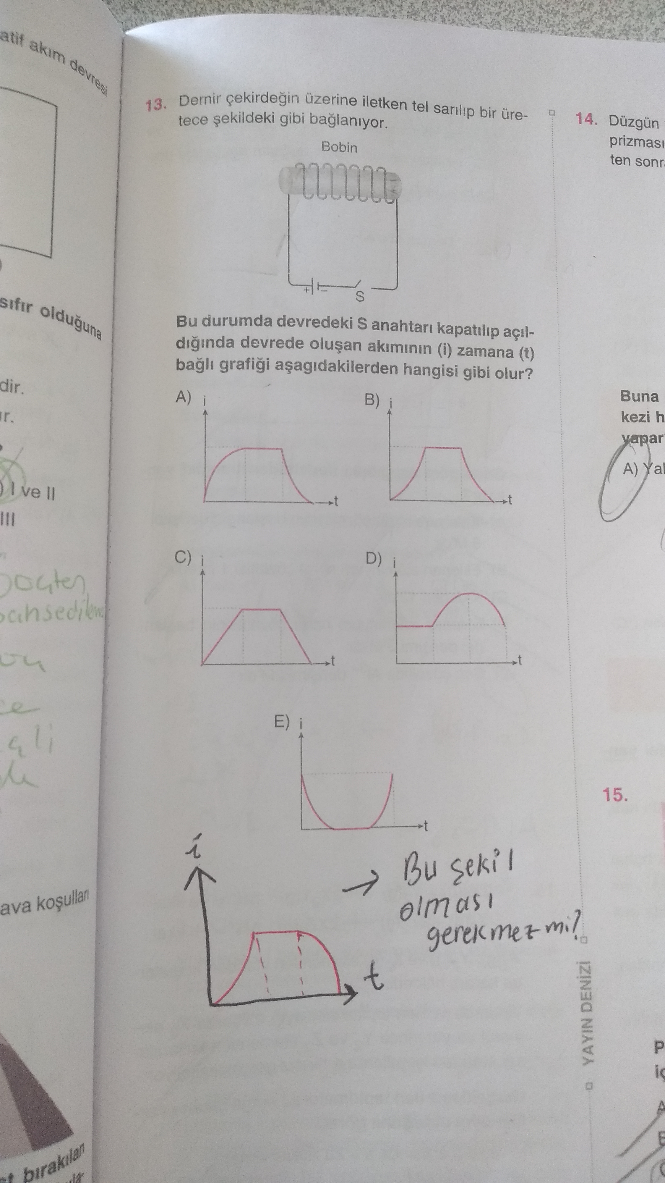 | Aşağıda çizdiğim gibi olması gerekmez mi? Anahtar kapatılınca İndüksiyon akımı gittikçe azalmaz mı? Yani devreye gösterdiği tepki azalır ve grafik daha eğimli olur. < Resime gitmek için tıklayın > |