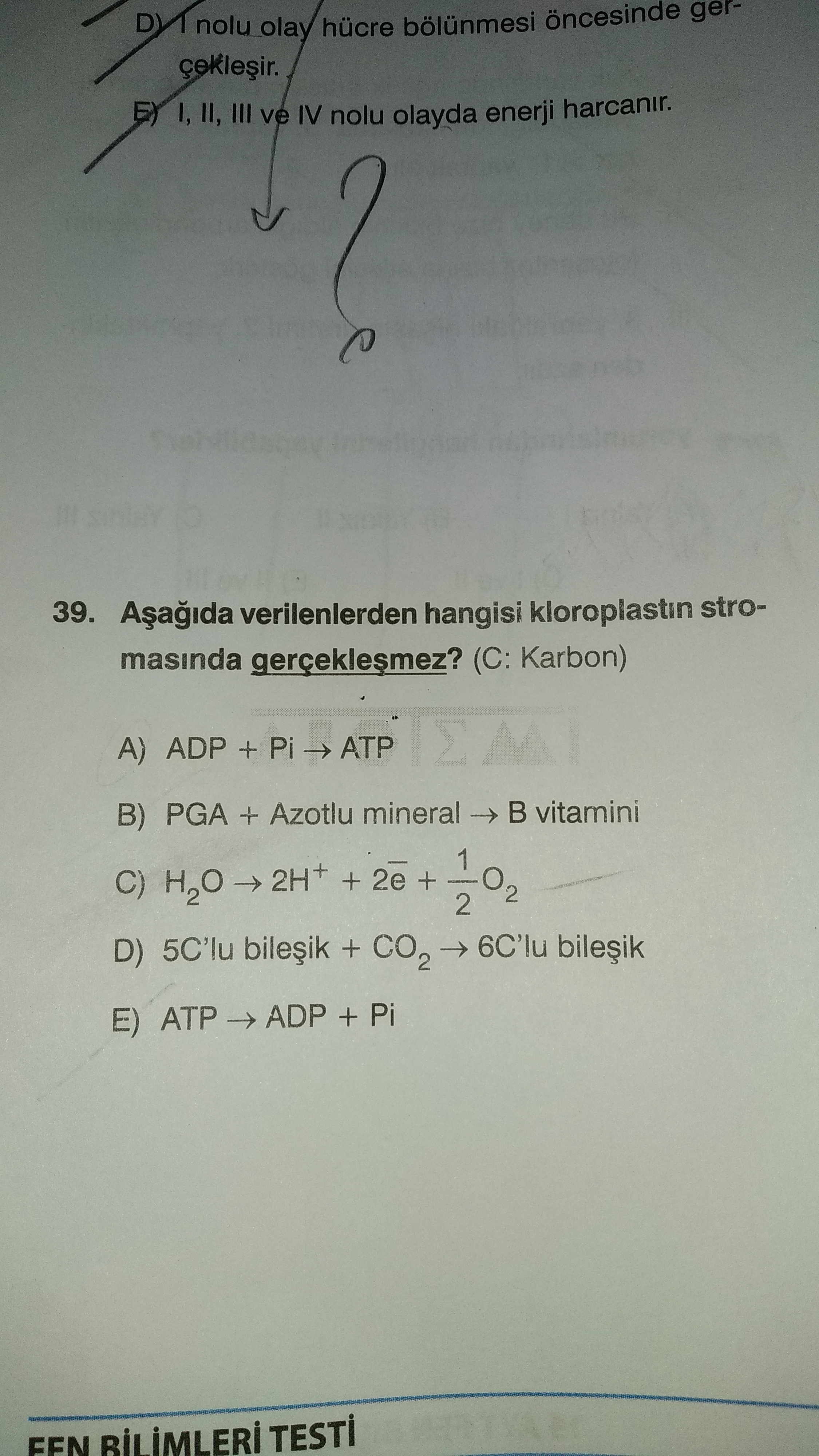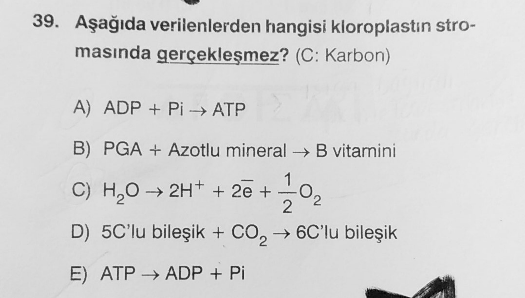 | Cevap c olduğunu biliyorum ancak A seçeneği kafamı karıştırıyor. Tilakoit zarda Atp sentezlenmez mi? Yani ışığa bağımlı evrede? Neden stroma kabul etmiş? < Resime gitmek için tıklayın > |