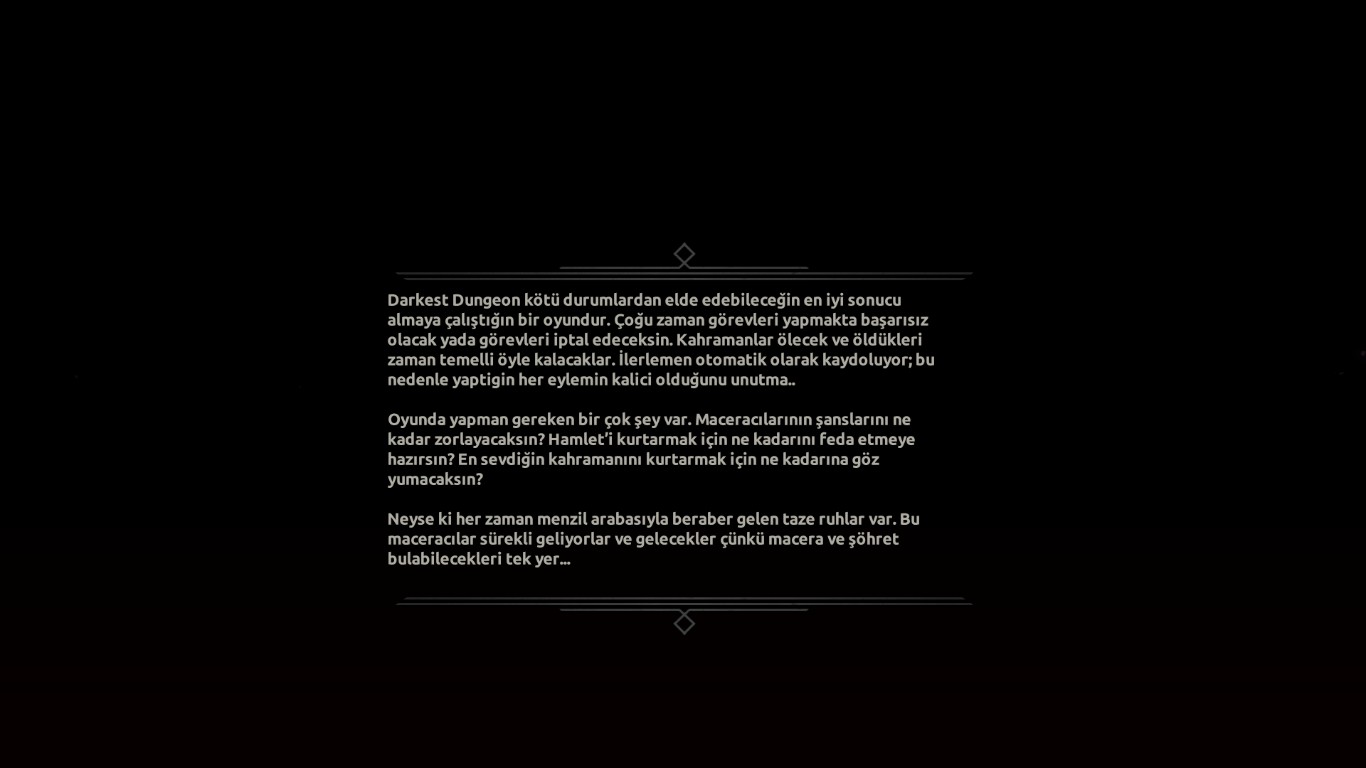 Merhaba arkadaşlar, Darkest Dungeon oyununun Türkçe Yamasının 2.0 sürümünü yayınlamış bulunmaktayız. Yamanın en güncel sürümünü Çeviri Canavarı sitesinden ücretsiz olarak indirebilirsiniz. Yama güncellemesini haftalık olarak bu konu altında bildireceğiz. Yamanın içerisine DLC'ler dahildir. Yamanın kurulum videosuna bu linkten ulaşabilirsiniz. Eğer bize bağış yaparak destek olmak isterseniz bu linki kullanabilirsiniz. En küçük desteğiniz bile bizler için çok değerlidir. İyi oyunlar dileriz... Yamanın Kurulumu: Rar'ın içerisindeki "localization" ve "dlc" klasörlerini oyunun kurulu olduğu klasöre atınız. Çeviri Durumu Menüler - 100% Arayüz - 100% Oyun İçi Eşyalar - 100% Diyaloglar - 100% Oyun İçi Görüntüler < Resime gitmek için tıklayın > < Resime gitmek için tıklayın > < Resime gitmek için tıklayın > Güncelleme Geçmişi 19-10-2020 => -DLC'lerin çeviri bitmiştir. -2.0 sürümü yayınlanmıştır. 24-08-2020 - Ana oyunun çevirisi bitmiştir. - 1.0 sürümü yayınlanmıştır. 09-08-2020 - Kahramanların diyaloglarının çevirisi ilerlemiştir. - Kalan yaklaşık satır sayısı = 1750 02-08-2020 - Kahramanların diyaloglarının çevirisi ilerlemiştir. - Kalan yaklaşık satır sayısı = 2000 27-07-2020 - Kahramanların diyaloglarının çevirisi ilerlemiştir. - Kalan yaklaşık satır sayısı = 2550 19-07-2020 - Kahramanların diyaloglarının çevirisi ilerlemiştir. - Kalan yaklaşık satır sayısı = 3000 12-07-2020 - Kahramanlar diyaloglarının çevirisi ilerlemiştir. - Kalan yaklaşık satyr sayısı = 3325 05-07-2020 - Kahramanlar diyaloglarının çevirisi ilerlemiştir. - Kalan yaklaşık satyr sayısı = 3650 28-06-2020 - Kahramanlar diyaloglarının çevirisi ilerlemiştir. - Kalan yaklaşık satır sayısı = 4000 07-06-2020 - Oyun içerisinde daha önceden "Ivır Zıvır" olarak çevrilmiş "Trinket" sözcüğü, artık "Ziynet" olarak çevrilmiştir. - Kahramanların diyaloglarının çevirisi ilerlemiştir. - Kalan yaklaşık satır sayısı = 4200 31-05-2020 - Kahraman diyaloglarının çevirisi ilerlemiştir. - Kalan yaklaşık satır sayısı = 4500 25-05-2020 - Kahraman diyaloglarının çevirisi ilerlemiştir. - Kalan yaklaşık satır sayısı = 4800 26-04-2020 - Yama 0.9.5 sürümüne güncellenmiştir. - Kahramanların diyaloglarının çevirisi ilerlemiştir. - Yamadaki bazı hatalar giderilmiştir. - Kalan yaklaşık satır sayısı = 5100 19-04-20 - Yama 0.9.4 sürümüne güncellenmiştir. - Günlük sayfaları çevrilmiştir. - Yamadaki bazı hatalar giderilmiştir - Kalan yaklaşık satır sayısı = 5400 12-04-2020 - Yama 0.9.3 sürümüne güncellenmiştir. - Nesnelerle olan etkileşimler çevrilmiştir. - Yamadaki bazı hatalar giderilmiştir. - Kalan yaklaşık satır sayısı = 5700 05-04-2020 - Yama 0.9.2 sürümüne güncellenmiştir. - Kasaba etkinlikleri çevrilmiştir. - Bazı nesnelerle olan etkileşimler çevrilmiştir. - Yamadaki bazı hatalar giderilmiştir. - Kalan yaklaşık satır sayısı = 6400 29-03-2020 - Yama 0.9.1 sürümüne güncellenmiştir. - Anlatıcı diyaloglarının tamamı çevrilmiştir. - Yamadaki bazı hatalar giderilmiştir. - Yaklaşık kalan satır sayısı = 7000 20-03-2020 = 0.8.8 versiyonuna yükseltildi 09-03-2020 = 0.8 versiyonuna yükseltildi 01-03-2020 = 0.7 açık betası yayınlandı 24-02-2020 = 0.6 versiyonuna yükseltildi 11-02-2020 = 0.5 versiyonuna yükseltildi 05-01-2020 = 0.4 versiyonuna yükseltildi 12-12-2019 = 0.3.5 versiyonuna yükseltildi 12-11-2019 = 0.2 versiyonuna yükseltildi 03-10-2019 = 0.1 versiyonuna yükseltildi 03-09-2019 = Yamanın Yapımına Başlandı |