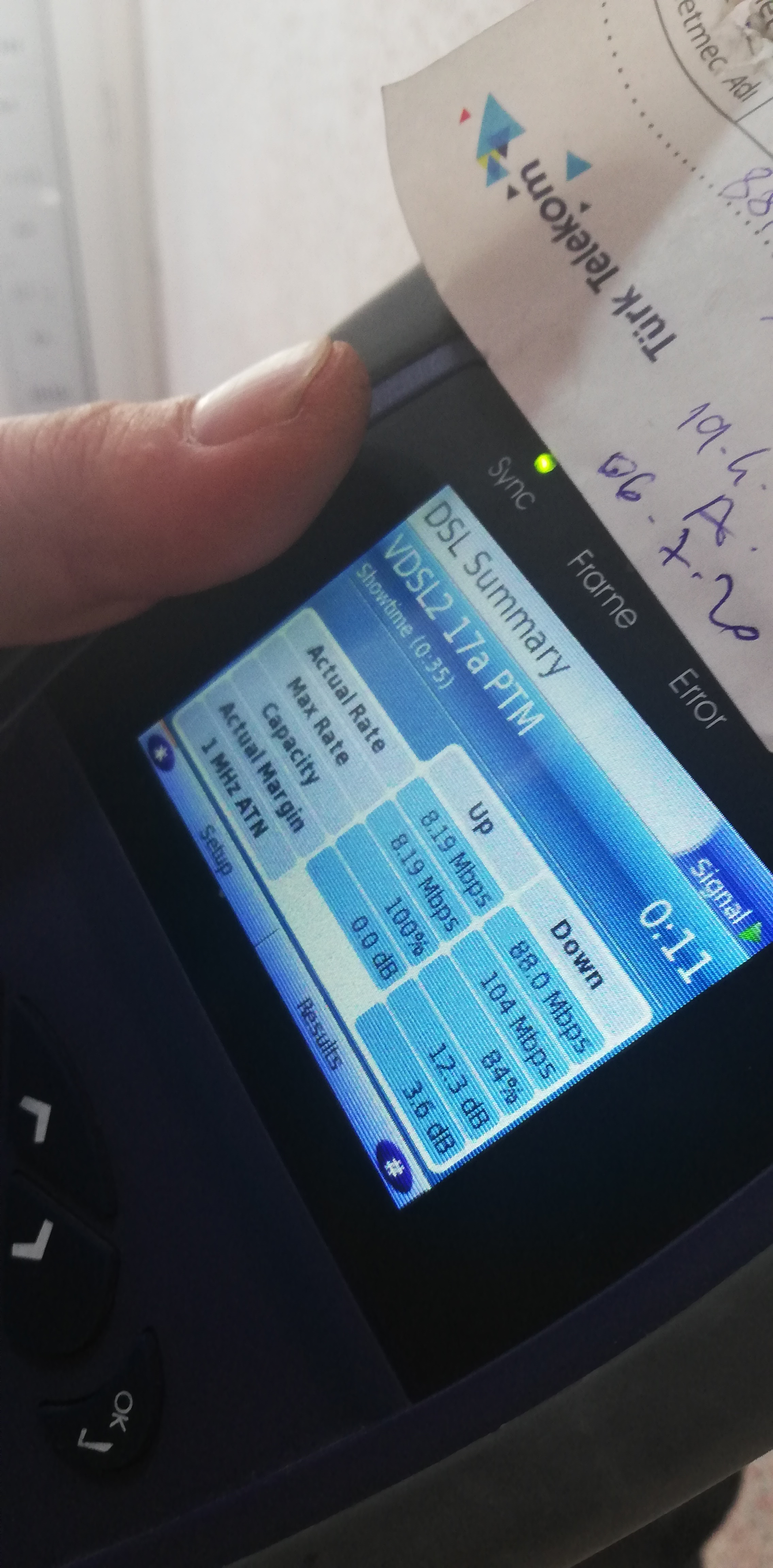 Az önce Türk Telekom görevlisi geldi ve hattımı test ettik. Testte 88 Mbps kilidim açıkça ortada. Alacağım Hız da ortada. Görevli, Müdürlüğe 100 Mbps istediğini bildiricem sende Turknet'ten 100 Mbps tanımlama iste dedi. < Resime gitmek için tıklayın > |