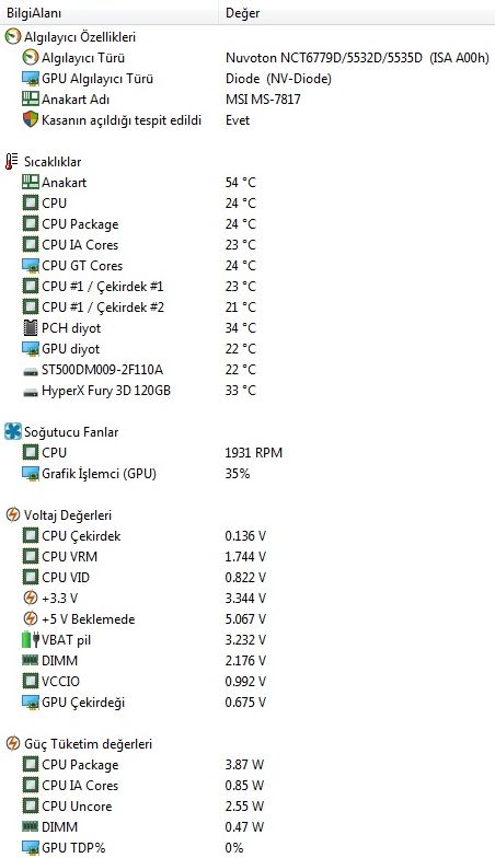 MSI H81M-P33 (MS-7817) Anakart ve i3 4170 3.7 GHz işlemci kullanıyorum. İlk günden beri anormal yüksek anakart sıcaklıkları ile karşılaşıyorum. Bilgisayar ilk açıldığı andan itibaren 50 derece üstü ve zamanla fazla değişim olmuyor. AIDA64 Extreme ile ölçüm yaptım ve programın sistemimle uyumsuz olması ihtimalini hesaba katıp 4-5 program kullandım. Sonuç değişmedi ama Speedfan çok saçma değerler verdi, bu değerler doğru olsa çoktan bilgisayar kapanmıştı. Speedfan yıllardır güncellenmediği için şaşırmamak lazım. < Resime gitmek için tıklayın > En güvenilir görülen AIDA64 Extreme sonuçları bunlar. < Resime gitmek için tıklayın > Bios’a girdim değerler oldukça normal gözüktü hatta anakart sıcaklığı işlemcinin altında ki bu çok normal. < Resime gitmek için tıklayın > Windows’da bir şeylerin işlemci veya anakartı aşırı çalıştırdığından şüpelendim, görev yöneticisinde anormal bir şey bulamadım, formatladım (Windows 7 SP1 64 bit) değerler değişmedi. İnternette yaptığım araştırmada aynı anakarta sahip başka biri de anakart ısısından şikâyet edip soru sorduğuna rastladım ama cevap bulamıyorum. Bios değerlerinin doğru olduğunu var saymak istiyorum ki bir şeyler yanmasın, sizce de bios değeri doğru ise Windows üzerinde doğru değerleri nasıl görebilirim. |