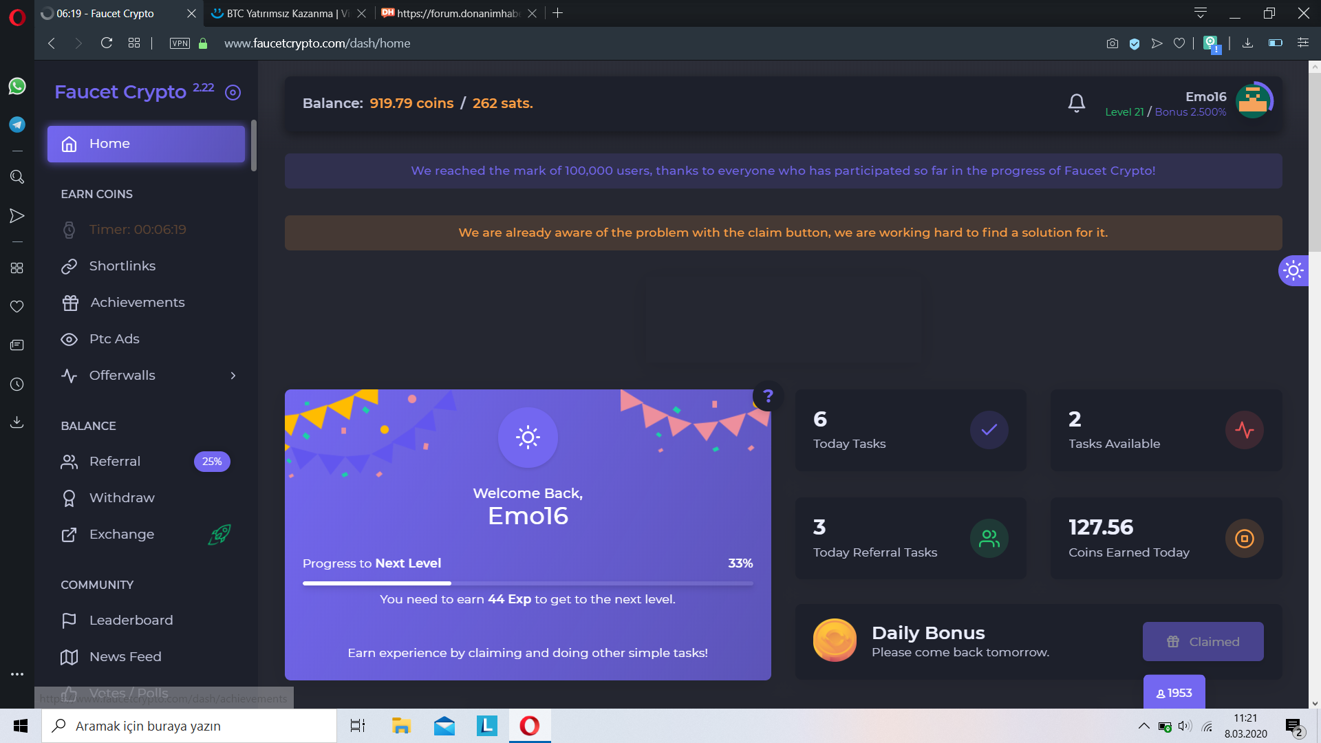 Arkadaşlar merhaba ücretsiz sadece site linklerine girerek ve 10 sn bekleyerek btc kazanıyoruz.Seviye sistemide mevcut görev yaptıkça hem level artıyor hem bonuslarınız buyrun kazanalım hep beraber.Yeterki herkes kazansın.Ve 30 dk bi bonus veriyor.