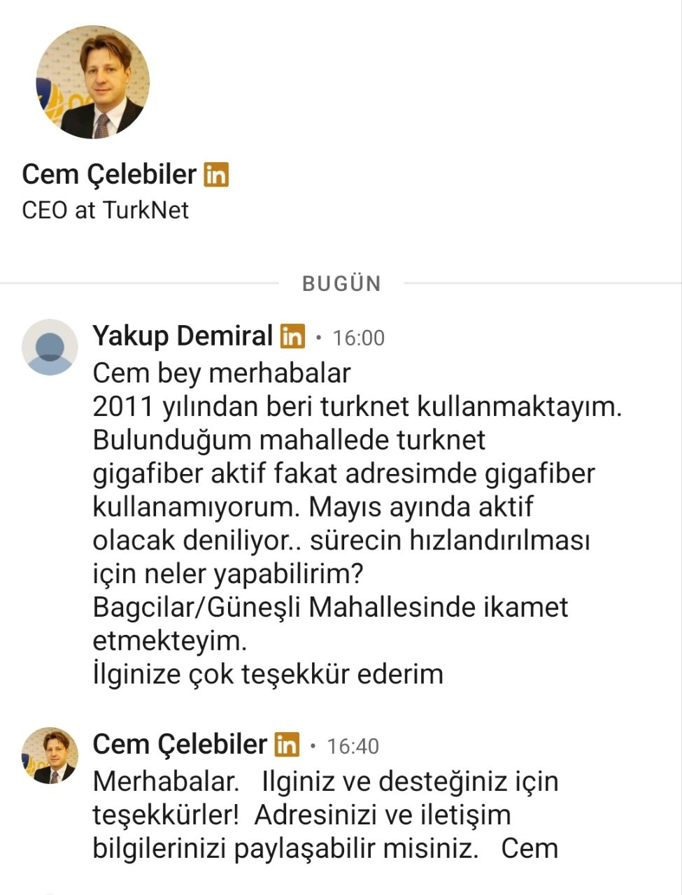 Linkedin üzerinden CEO Cem Celebiler Bey'e Adres ve İletişim Bilgilerimi Gönderdim.