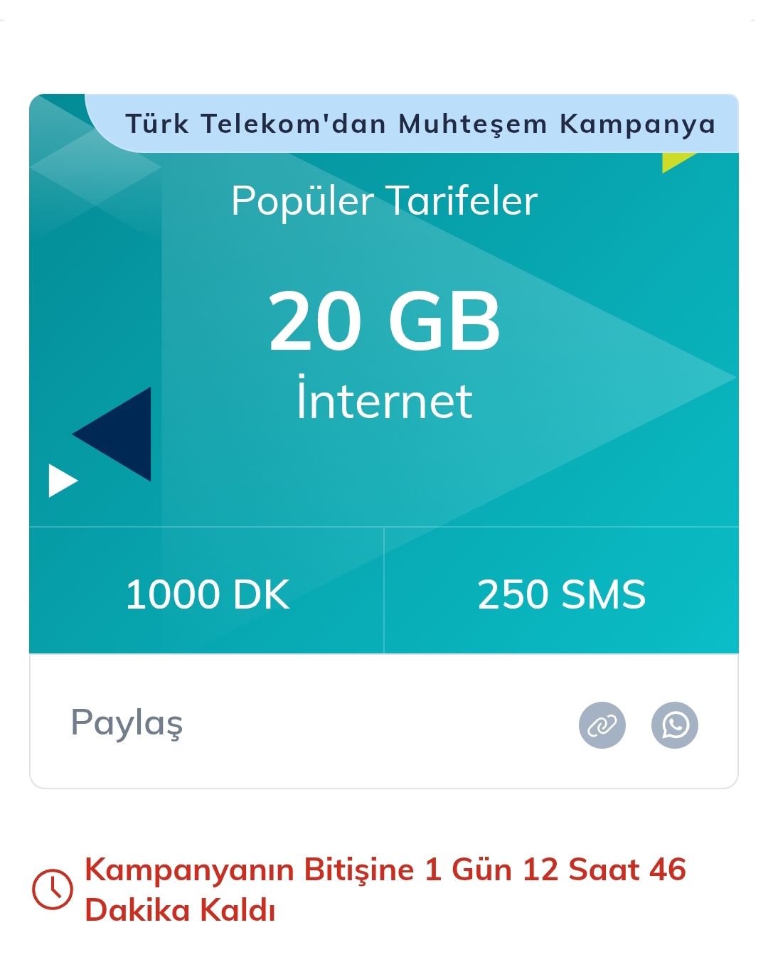 Popüler 20GB Tarifesi Türk Telekomden Muhteşem Fırsat ! Popüler 20GB Tarifesi her ay yurt içinde geçerli 20 GB internet, 1000 dakika konuşma ve 250 SMS içermektedir. Kampanya Son Katılım Tarihi: 13.07.2025 < Resime gitmek için tıklayın > |