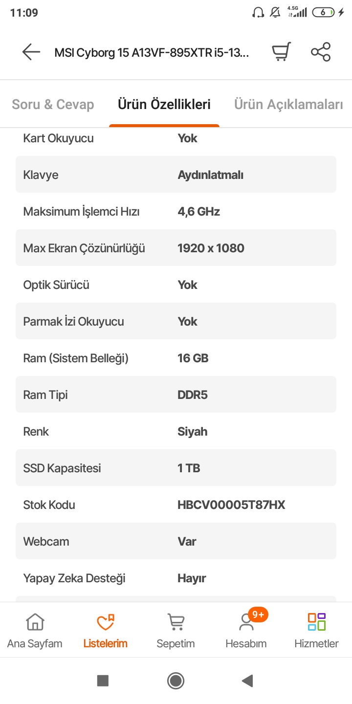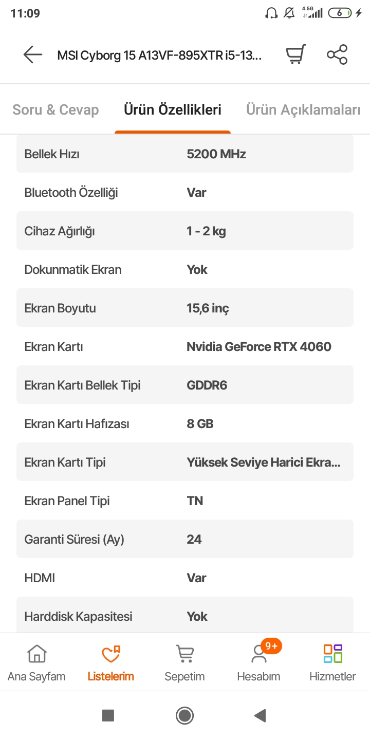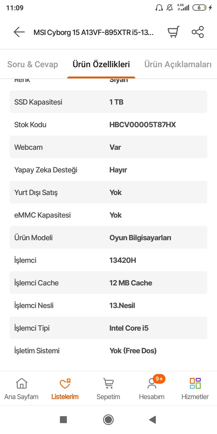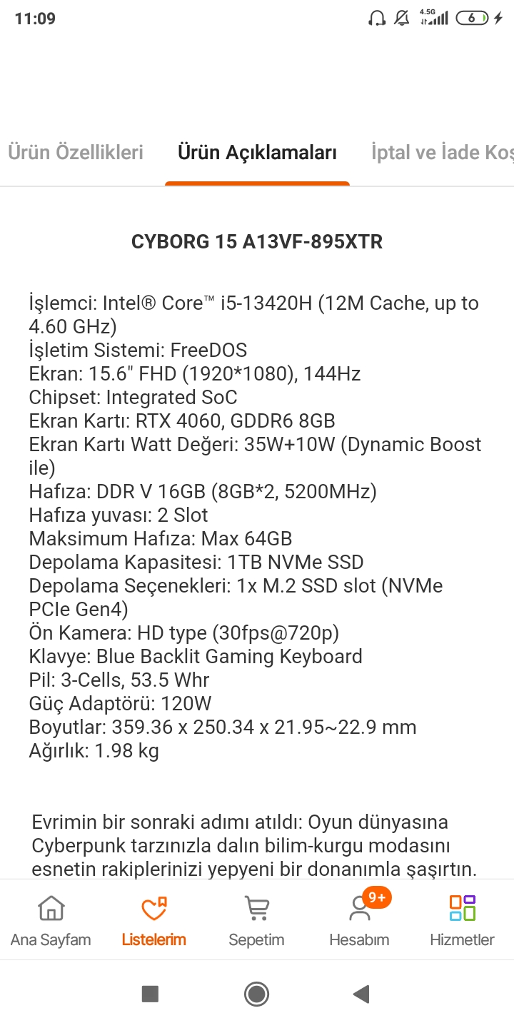 Bu bilgisayar alınır mı bilgisayar mühendisliği için? https://app.hb.biz/ZDbmPc5xJk42 CYBORG 15 A13VF-895XTR İşlemci: Intel® Core™ i5-13420H (12M Cache, up to 4.60 GHz) İşletim Sistemi: FreeDOS Ekran: 15.6" FHD (1920*1080), 144Hz Chipset: Integrated SoC Ekran Kartı: RTX 4060, GDDR6 8GB Ekran Kartı Watt Değeri: 35W+10W (Dynamic Boost ile) Hafıza: DDR V 16GB (8GB*2, 5200MHz) Hafıza yuvası: 2 Slot Maksimum Hafıza: Max 64GB Depolama Kapasitesi: 1TB NVMe SSD Depolama Seçenekleri: 1x M.2 SSD slot (NVMe PCIe Gen4) Ön Kamera: HD type (30fps@720p) Klavye: Blue Backlit Gaming Keyboard Pil: 3-Cells, 53.5 Whr Güç Adaptörü: 120W Boyutlar: 359.36 x 250.34 x 21.95~22.9 mm Ağırlık: 1.98 kg < Resime gitmek için tıklayın > < Resime gitmek için tıklayın > < Resime gitmek için tıklayın > < Resime gitmek için tıklayın > |