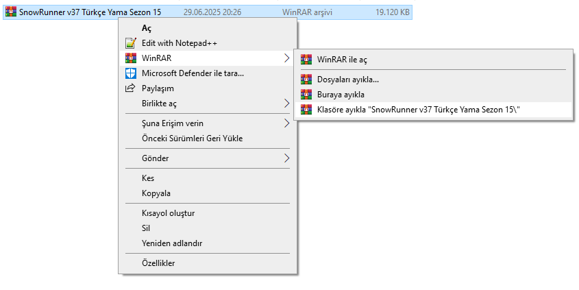< Resime gitmek için tıklayın > EMEĞİ GEÇENLER PROJE YÖNETİCİSİ NİCOLA ÇEVİRMENLER GAMER YUMİ NİCOLA TESTER NİCOLA PAKETLEME NİCOLA DİSCORD SUNUCUMUZ https://discord.com/invite/wKa8pgQPFg YAMA LİNKLERİ SnowRunner Eski Türkçe Yama v37.1.Sezon 15 SnowRunner Yeni Türkçe Yama v37.1.Sezon 15 Güncellemesi ŞİFRE: AralGameÇeviri NOTLAR – Bu yama AralGameÇeviri ekibi tarafından yapılmıştır. – Türkçe yama, oyunun İngilizce sürümüne uygun şekilde hazırlanmıştır. – Oyun içinde kullanılan grafikler, kalıplar dışındaki metinler Türkçe’ye çevirilmiştir. – Türkçe yamadan memnun kalmazsanız, kaldırarak orijinal sürüme geri dönebilirsiniz. Yama, Xbox GamePass sürümü dahil olmakla birlikte EPIC ve Steam üzerinden de sorunsuz çalışmaktadır. **3 Platforma’da aynı anda güncelleme gelmiyorsa ve sürüm numaraları farklı ise yama platformlar arasında çalışmayabilir. Her zaman Steam’e göre güncelliyoruz.** Yamayı kuramaz ya da herhangi bir sorunla karşılaşırsanız Discord sunucumuza gelip destek alabilirsiniz. SnowRunner Türkçe Yama Steam kurulumu: 1 – Yamayı indirdikten sonra RAR dosyasına sağ tıklayın ve klasöre çıkartın. Çıkan dosyayı kopyalayın. < Resime gitmek için tıklayın > 2 – Steam kütüphanenizden Snowrunner’a sağ tıklayın be özellikler diyin.** < Resime gitmek için tıklayın > 3- Bu ekranda Yüklü Dosyalara basarak Göz At diyin. < Resime gitmek için tıklayın > 4- Açılan klasörlerden sırasıyla preload\paks\client klasörlerinin içerisine girelim. Ekranınız aşağıdaki gibi gözükmesi lazım. < Resime gitmek için tıklayın > 5 – 1. aşamada kopyaladığımız dosyayı buraya yapıştıralım ve karşımıza çıkan uyarıda “Tümüne Evet” butonuna basalım. Snowrunner artık Türkçe bir şekilde karşınızda Snowrunner Türkçe Yama Xbox Gamepass Kurulumu 1 – Xbox Gamepass programı üzerinden mouse’u getirince kenarında 3 nokta beliriyor buna tıklıyoruz. < Resime gitmek için tıklayın > 2 – Açılan pencerede “Yönet” diyoruz. < Resime gitmek için tıklayın > 3 – Açılan pencereden “Dosyalar” kısmına bastıktan sonra aşağıdaki “Göz at” butonuna basıyoruz. < Resime gitmek için tıklayın > 4 – Snowrunner klasörünü bulup sırasıyla bu klasörleri açıyoruz. “Content>Paks” Bu şekilde gözükmelidir. < Resime gitmek için tıklayın > **5 – 1. aşamada kopyaladığımız dosyayı buraya yapıştıralım ve karşımıza çıkan uyarıda “Tümüne Evet” butonuna basalım. Snowrunner artık Türkçe bir şekilde karşınızda.** **Snowrunner Türkçe Yama Epic Games Kurulumu** **1 – Epic Games’i açıyoruz ve ardından kütüphaneye tıklayarak Snowrunner’ı buluyoruz.** < Resime gitmek için tıklayın > 2 – Sağ alt köşesindeki 3 noktaya basarak “yönet” diyoruz. < Resime gitmek için tıklayın > 3 – Yükleme satırının sağ tarafındaki klasör işaretine tıklıyoruz. < Resime gitmek için tıklayın > 4 – Açılan klasörlerden sırasıyla en_us\preload\paks\client klasörlerinin içerisine girelim. Ekranınız aşağıdaki gibi gözükmesi lazım. < Resime gitmek için tıklayın > 5 – 1. aşamada kopyaladığımız dosyayı buraya yapıştıralım ve karşımıza çıkan uyarıda “Tümüne Evet” butonuna basalım. Snowrunner artık Türkçe bir şekilde karşınızda. EKRAN GÖRÜNTÜLERİ < Resime gitmek için tıklayın > < Resime gitmek için tıklayın >< Resime gitmek için tıklayın >< Resime gitmek için tıklayın >< Resime gitmek için tıklayın >< Resime gitmek için tıklayın > |
