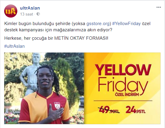 Merhaba arkadaşlar. Taraftar desteği ile gerçekleşen çok güzel bir kampanya var bu günlerde. Klubün gelirlerinin yanında kampanyayı genişletebileceğimiz bir durum daha var sizlerede iletmek istedim. Metin Oktay forması sadece 25TL ye satılıyor. Bu gün Çorlu Orion AVM de 3 arkadaş GSStore önünde duruyor sohbet ediyorlardı. İçlerinden birisi alamamıştı. Sonrası malumunuz mutlu bir çocuk. Sizlerden ricam AVM leri gezerken mutlu edebileceğiniz çocuklar var. < Resime gitmek için tıklayın > Düzenleme hali hazırda ultraslan bu şekilde bir kampanya yapmış farketmemiştim. < Resime gitmek için tıklayın > |
