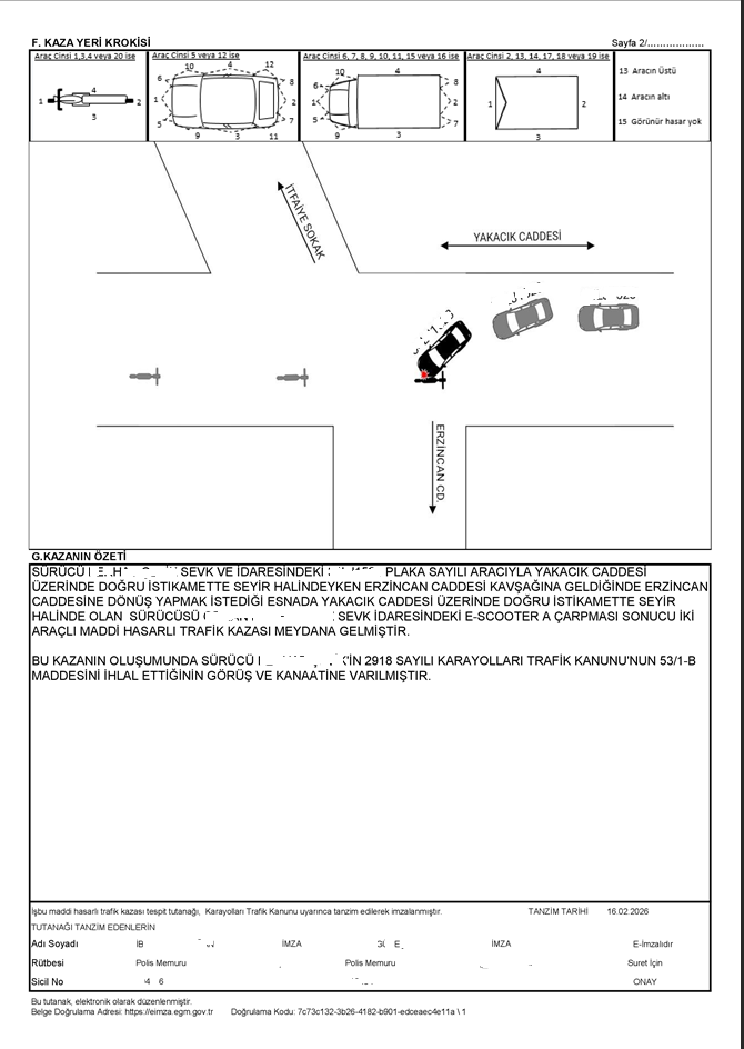 2 gün önce ben scooter ile gidiş geliş yolda giderken başka bir araç karşı şeritten sokağa dönerken bana çarptı. Polis aradım yaklaşık 45dakika bekledim ve geldiler. Olayı anlattım tutanak istediğimi söyledim. Araçların fotoğrafını çektiler diğer aracın ehliyeti benim nufus cüzdanımı ibraz ettim. Alkol testi yapıldı. Ertesi gün e devlete tutanak düştü. Şimdi yetkili servisten parça ücreti için teklif alıp karşı tarafın trafik sigortasından beyan ile ücreti talep edicem. < Resime gitmek için tıklayın > < Resime gitmek için tıklayın > |