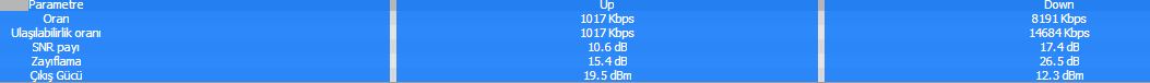 arkadaşlar şu an sorunsuz 7 mb alıyorum az önce 16 mb e geçiş yaptım ama henüz aktif olmadı.. Hattımın değerlerşi nasıl? 16 mb alabilirmiyim? modemde ulaşılabilir hız 14 mb diyor , 16 mb e geçtiğimde modem hiçmi bağlanmaz yoksa bağlanır ama 14 mb mi alırım bi el atın lütfen.. Parametre Up Down Oran 1017 Kbps 8191 Kbps Ulaşılabilirlik oranı 1017 Kbps 14684 Kbps SNR payı 10.6 dB 17.4 dB Zayıflama 15.4 dB 26.5 dB Çıkış Gücü 19.5 dBm 12.3 dBm https://mini.donanimhaber.com/images/upfiles/416475/d5a7de2f-81f2-425e-a320-8a93c40e5d66.JPG < Resime gitmek için tıklayın > |