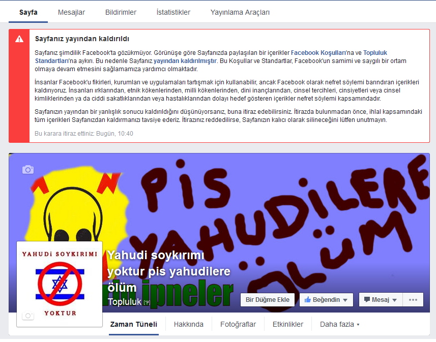 Deneme maksatlı bi sayfa açmıştım PİS YAHUDİLERE ÖLÜM DİYE :) sayfa bayağı bi durdu ne zamanki 2 -3 beğeni aldı bu sabah itibari ile GÜMMM . itiraz ettim bakalım ne olacak ;) < Resime gitmek için tıklayın > |