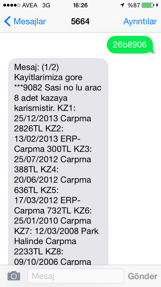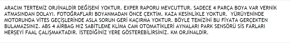 Arkadaşlar Merhaba, 2004 aracımı içim gayet rahat, kazası belası sıkıntısı ne ise söyleyerek bugün sattım. Malum sitede 2006 model bir araç buldum, satan galeriye sorduğumda 2-3 parça boya var diye söyledi. ilan numarasını söylemeyeceğim, yazan aynen aşağıda. < Resime gitmek için tıklayın > merak edip tramer sorgulamasını yaptığımda da çıkan sonuç aşağıda.. hadi minimum miktarlar önemli değil de, büyük miktarlar için de çizikten dolayı çıkıyor diye söylüyor. < Resime gitmek için tıklayın > şöyle birşey soracağım... piyasada kime güveneceğiz ?? < Resime gitmek için tıklayın >< Resime gitmek için tıklayın > |