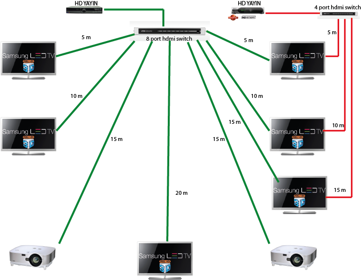 Merhaba, 8 televizyonlu bir işletmede kullanılmak üzere HDMI kabloya ihtiyacım var. Daha önceki deneyimlerime göre kablolar sıklıkla bozuluyor veya görüntü gitmesi problemi yaşıyorum. 8 port ve 4 port olmak üzere 2 switch kullanmak istiyorum. Duruma göre switch kablolarını değişip iki veya daha fazla yayını aynı anda sunmak istiyorum. Temsili resmi ekledim. Sorun şu; 1- Yapmış olduğum sistemde. Herhangi bir televizyonda sorun çıkması durumda ( sinyal gitmesi, kapanması,vs.) tüm tv lerde yayın gitmekte ve tekrar gelmekte. Bunu ortadan nasıl kaldırabilirim. 2-Kaliteli kablo kullanın diyorlar, ama şunu düşünüyorum. HDMI da görüntü ya vardır ya yoktur (0-1). bozuk gösteriyor veya sinyal düştü gibi sorunlar olmaması lazım. Yayınlar 1080p olacak ve switch in testekliyor olması gerekiyor. 3- böyle bir sistem için önereceğiniz kablo ve swtich markası ne olur. (5 metresi 1000 lira kablolar söylemeyin lütfen :) ) Şimdiden teşekkürler < Resime gitmek için tıklayın > |